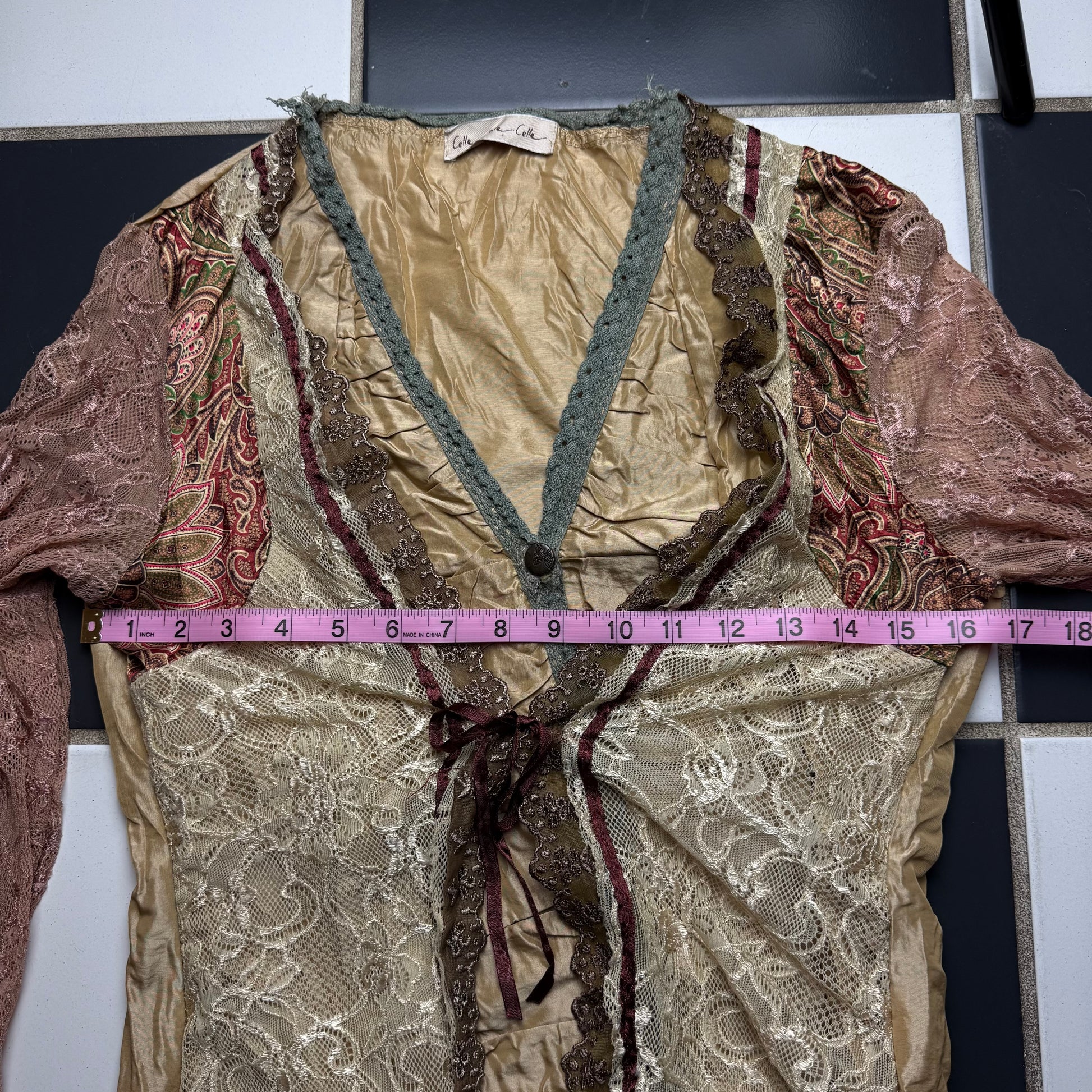The cutest longsleeve top with lace sleeves <3 it can also double as a sweater and wear a tank top underneath! She has a double layer with buttons and then a lace ribbon to tie in the front <3 size: best fits medium, check measurements