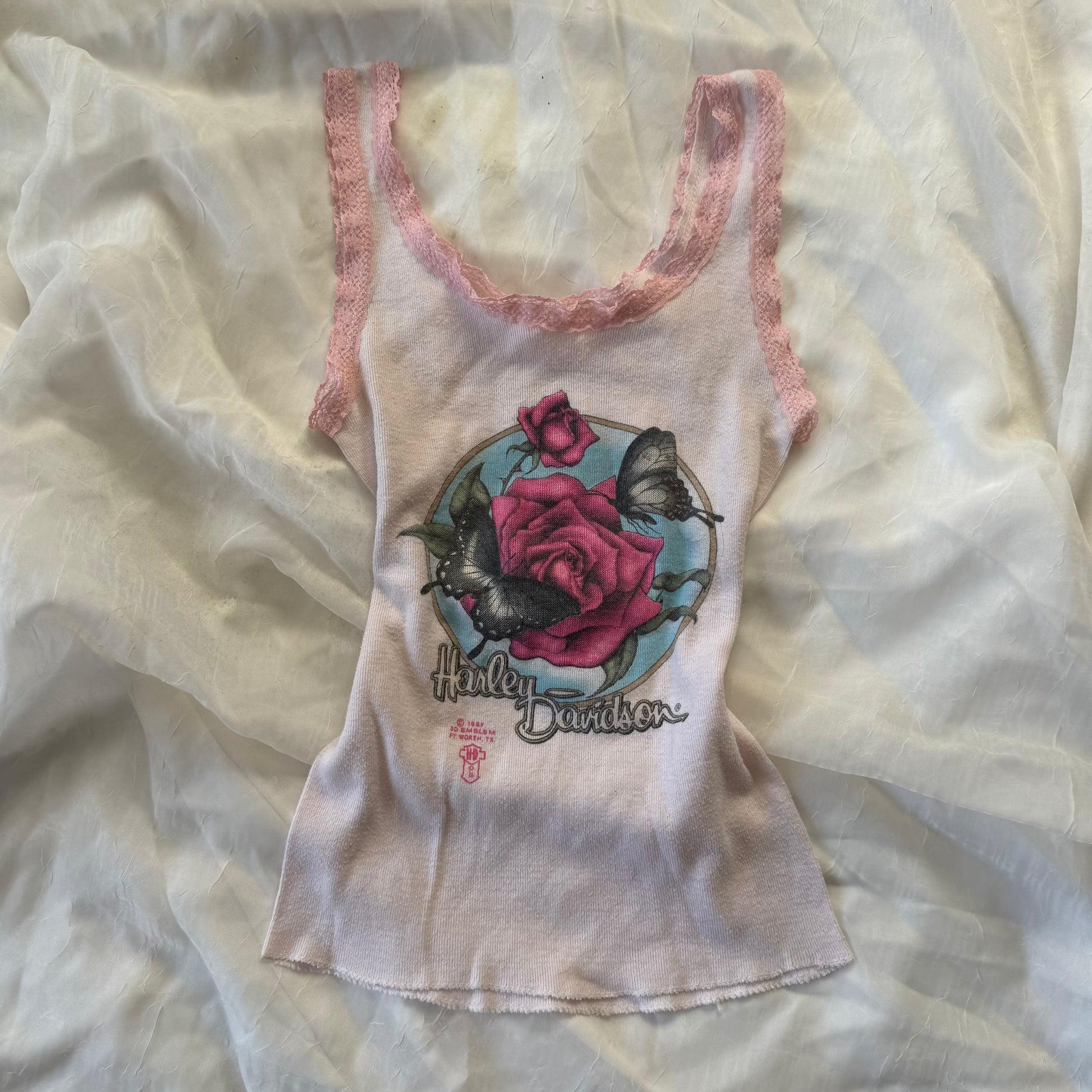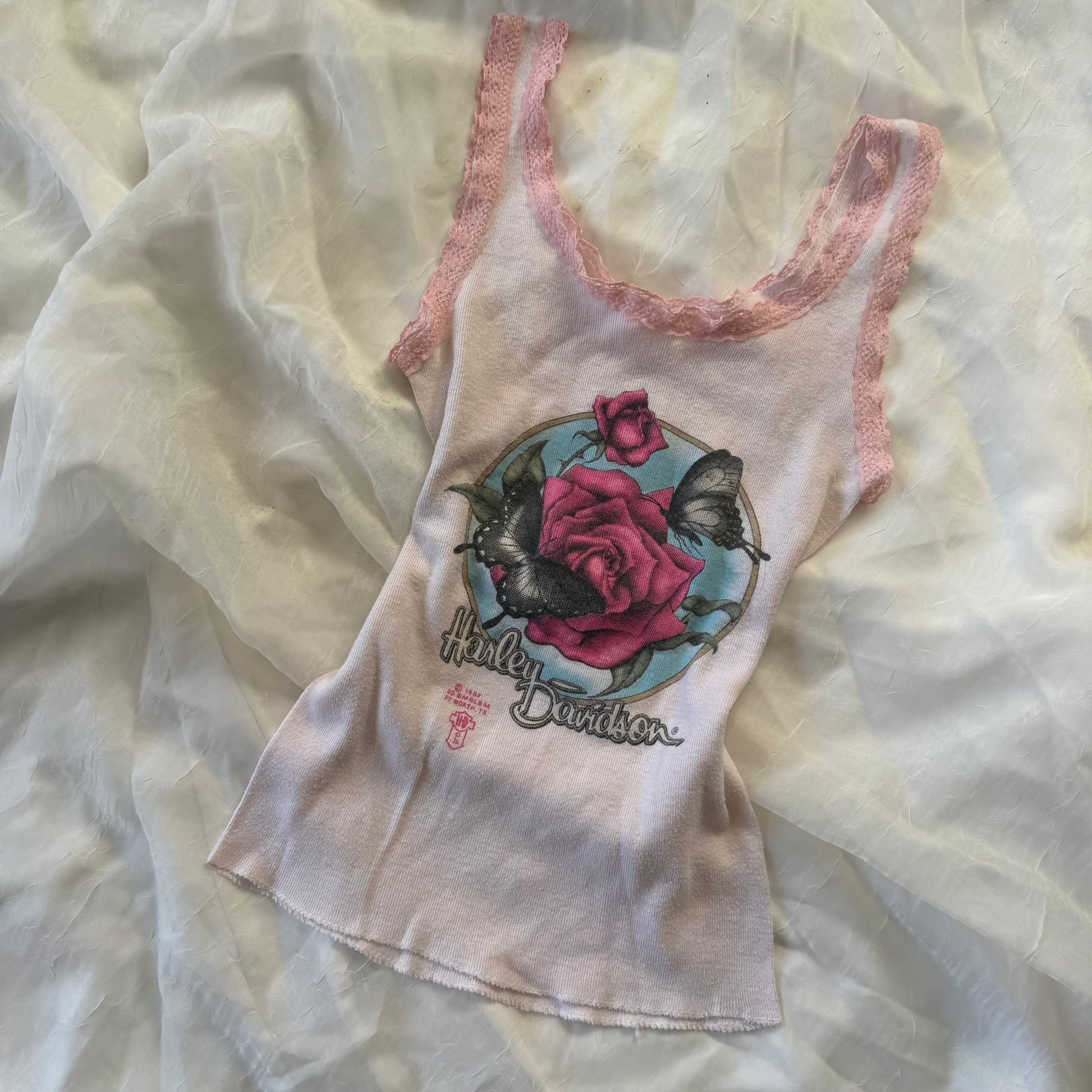 The perfect hArely Davidson white tank top with pink lace trim on the arms and neck <3 it has the graphic of a pink rose and butterflies with the date 1987.