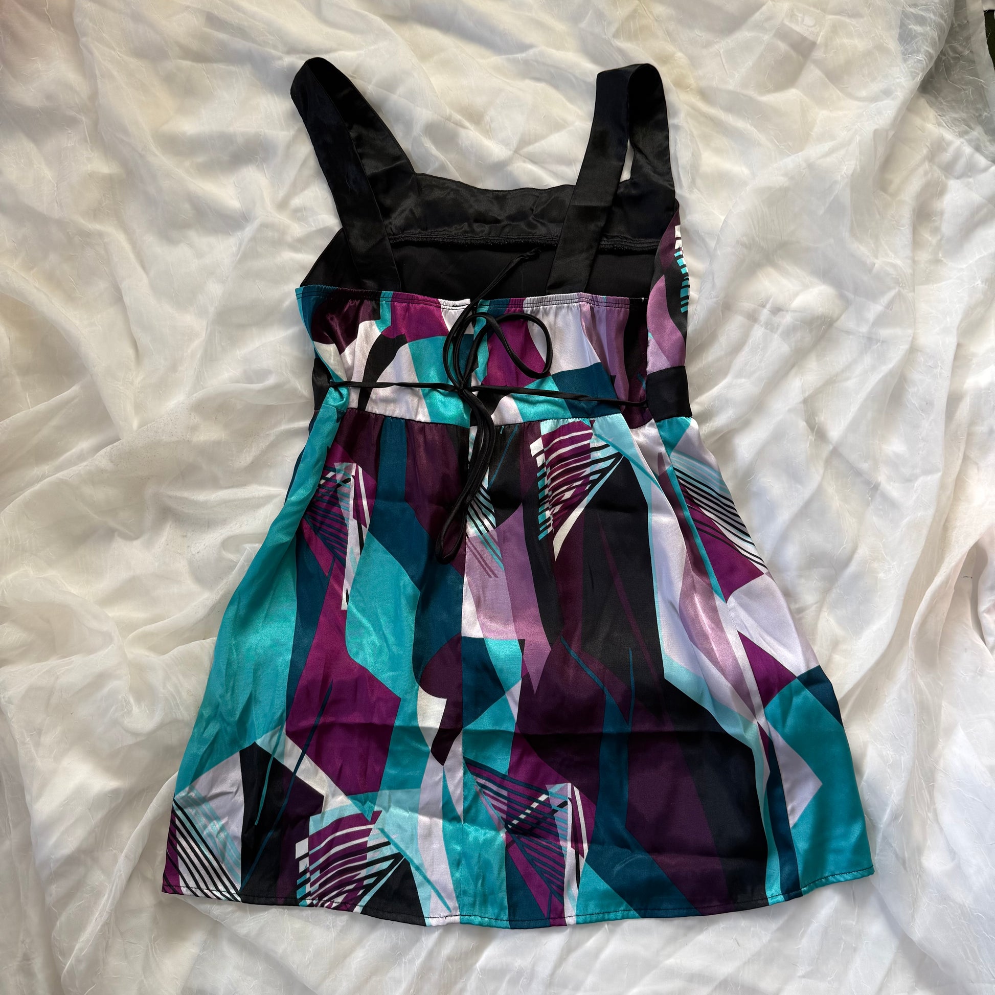 The perfect turquoise, white and purple cami top with strings to tie at the back <3 the top has matching black and turquoise gems!