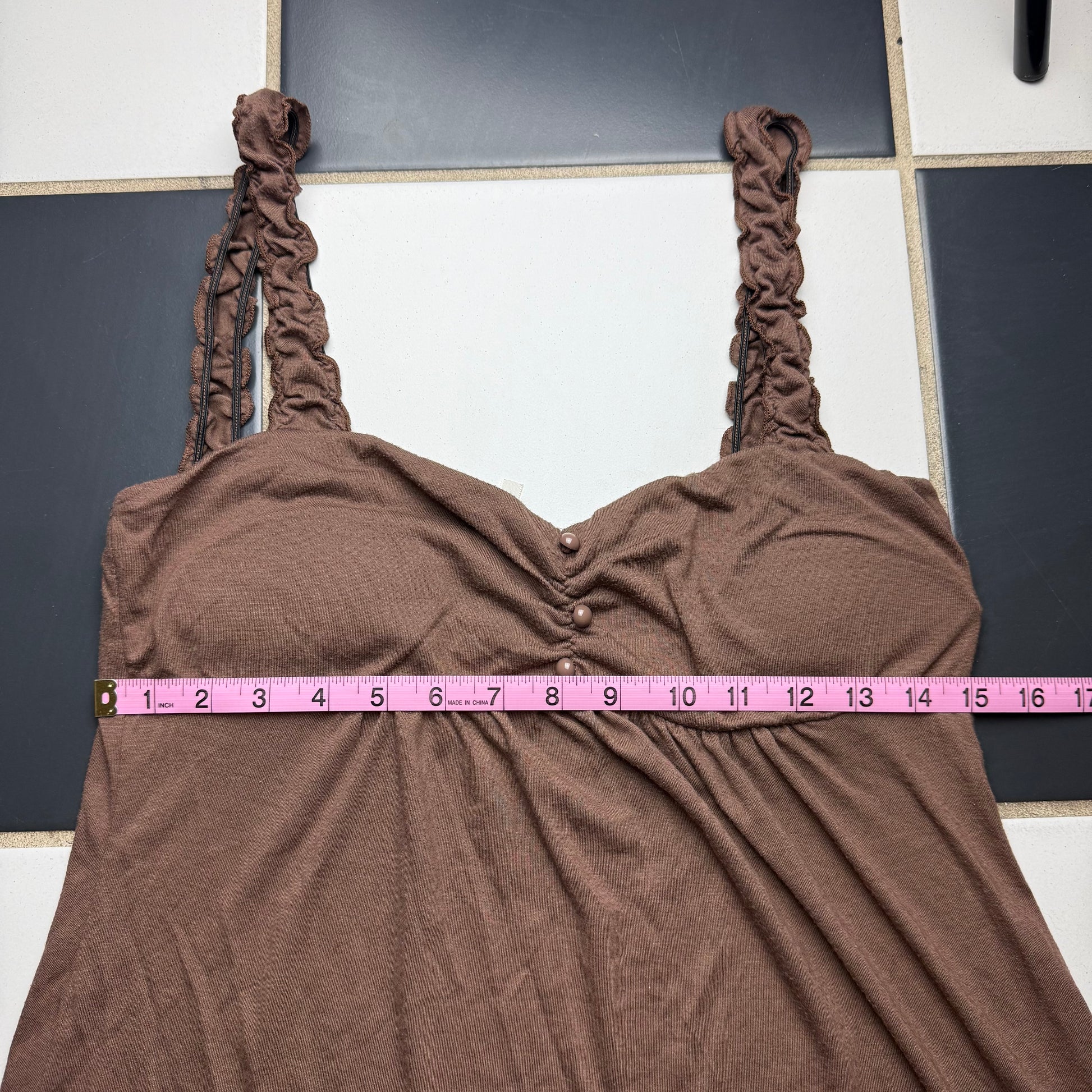 The cutest brown babydoll cami top with a lettuce hem on the straps <3 it has buttons in the middle!