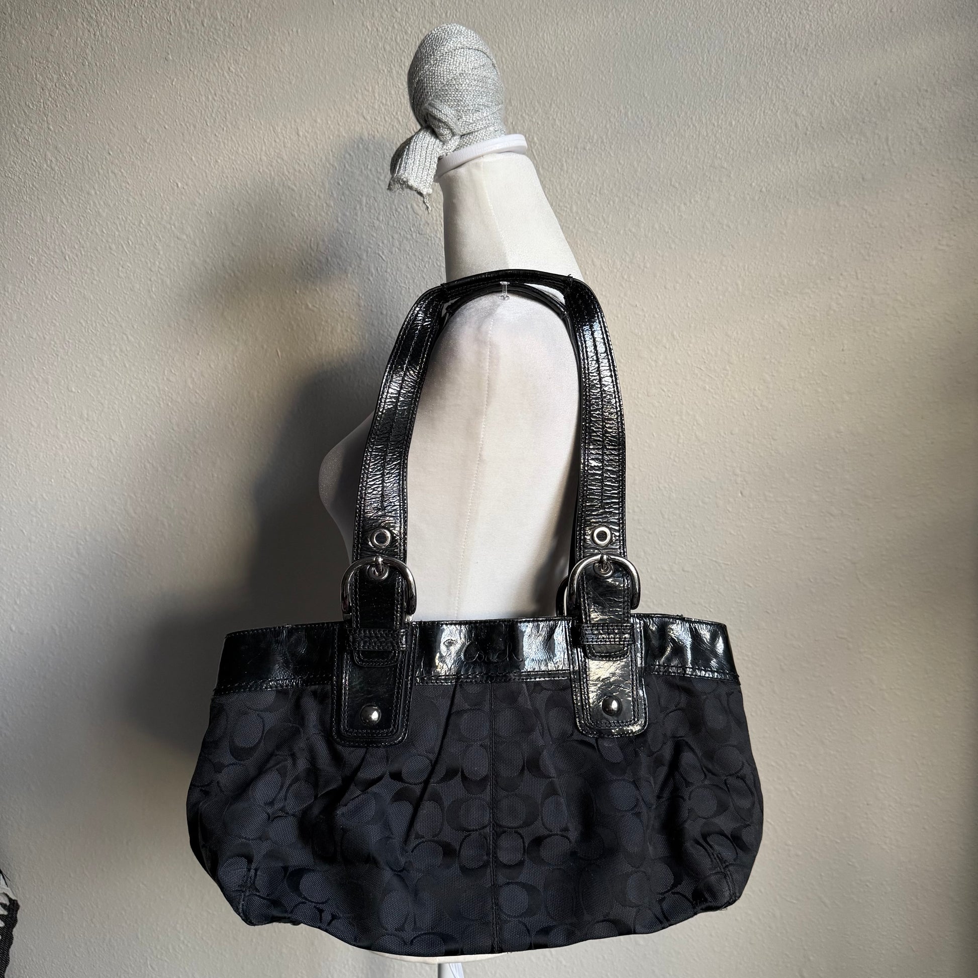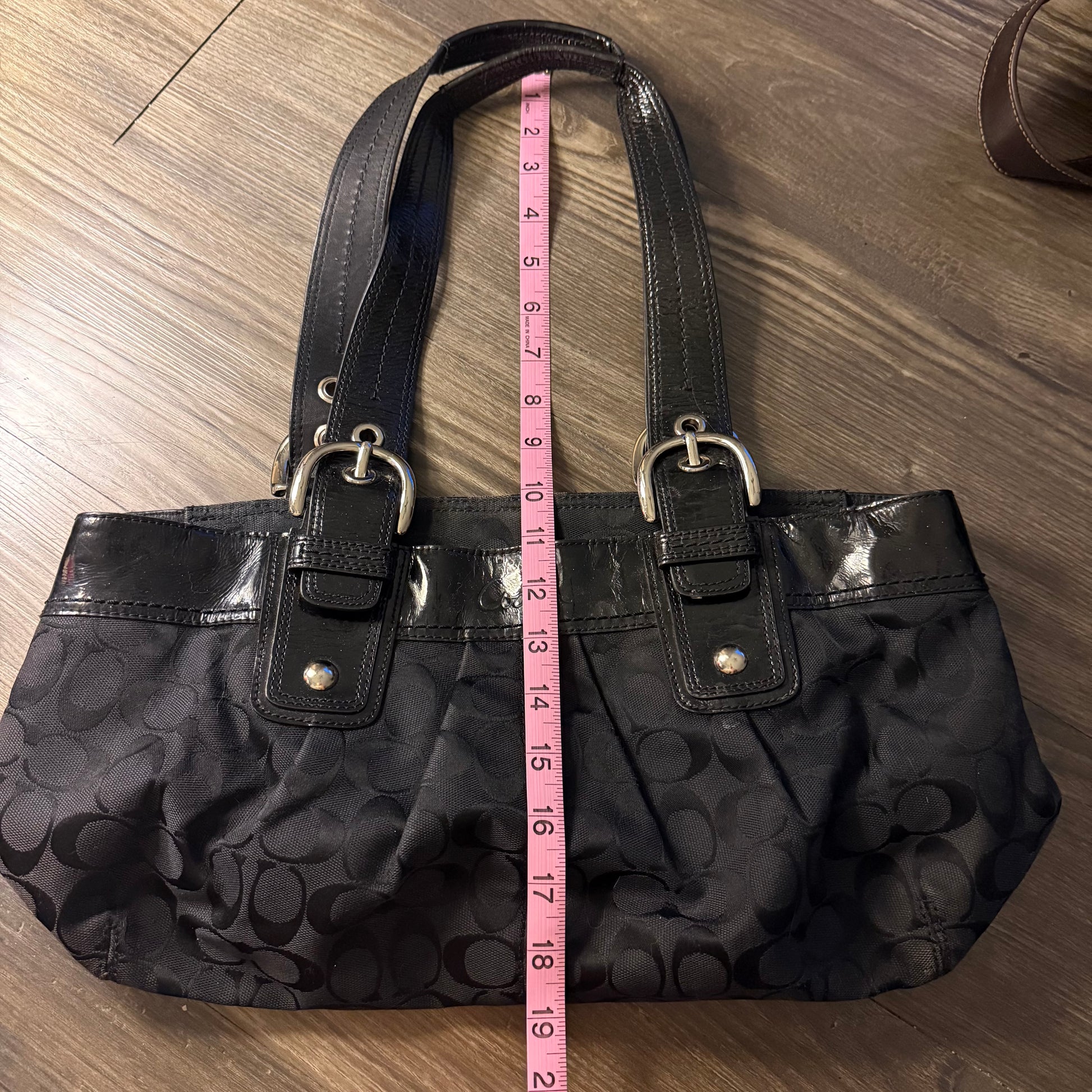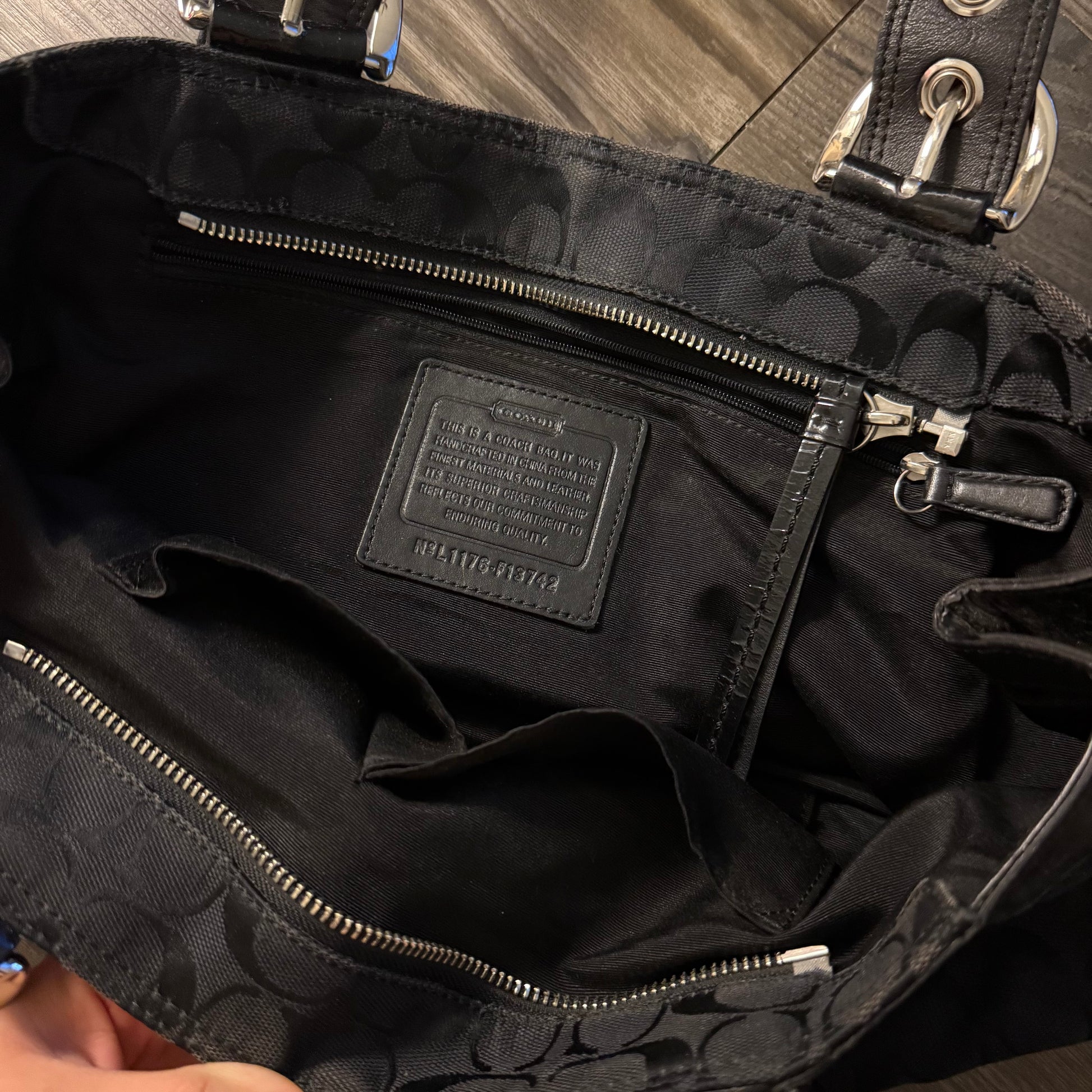 The cutest black monogram logo coach shoulder bag with buckles on the straps to adjust <3 the inside has a zipper pocket!
