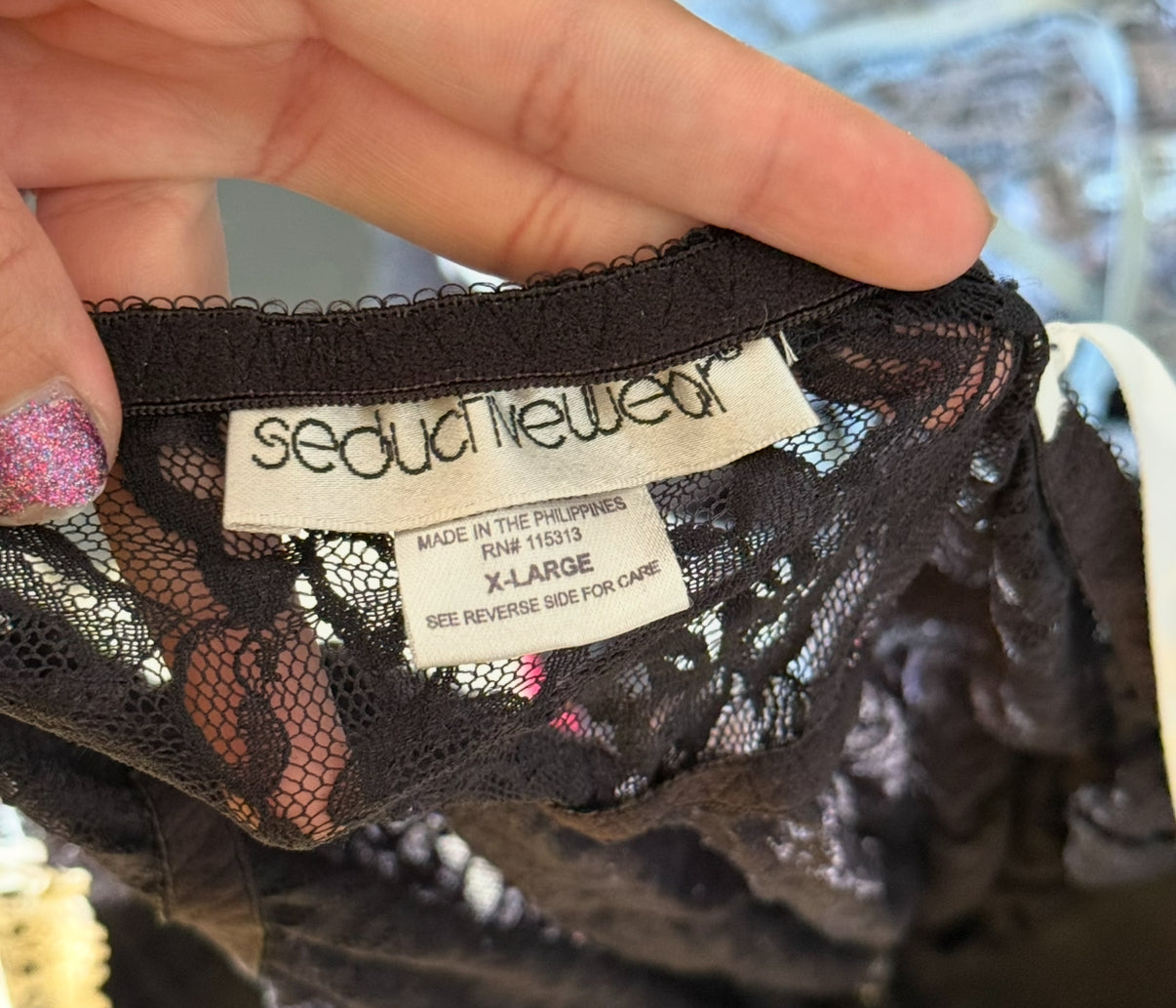 The cutest black lingerie piece with black lace and white trim with a ribbon in the middle <3 marked as an XL but refer to measurements!
