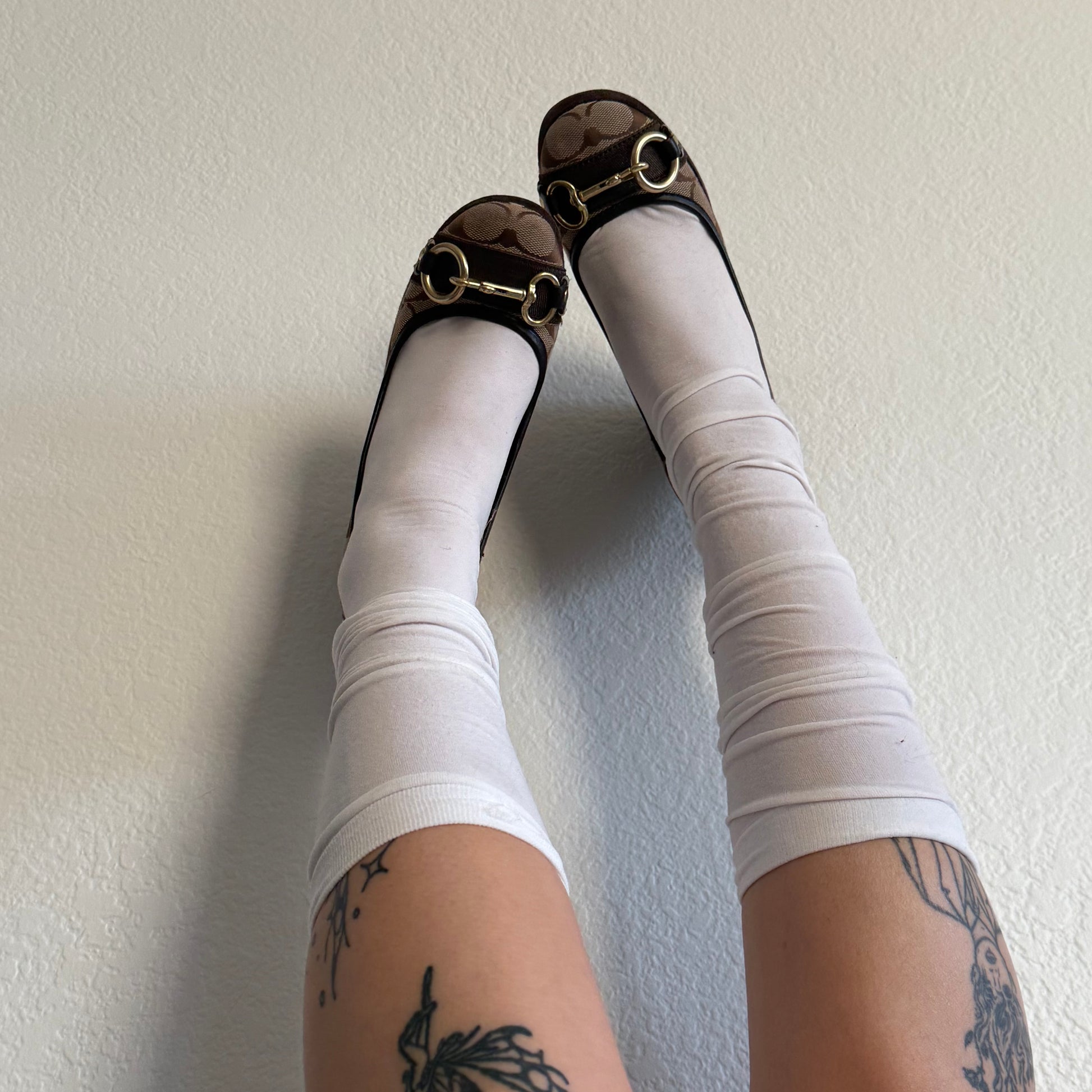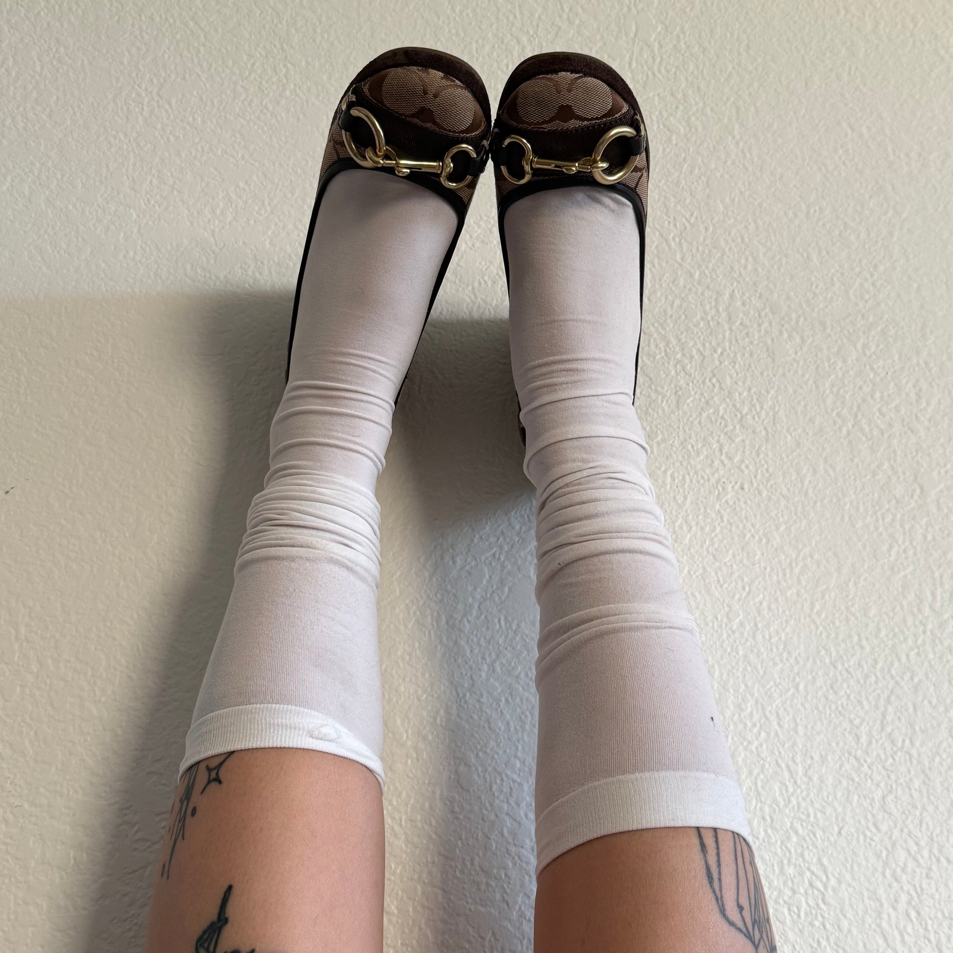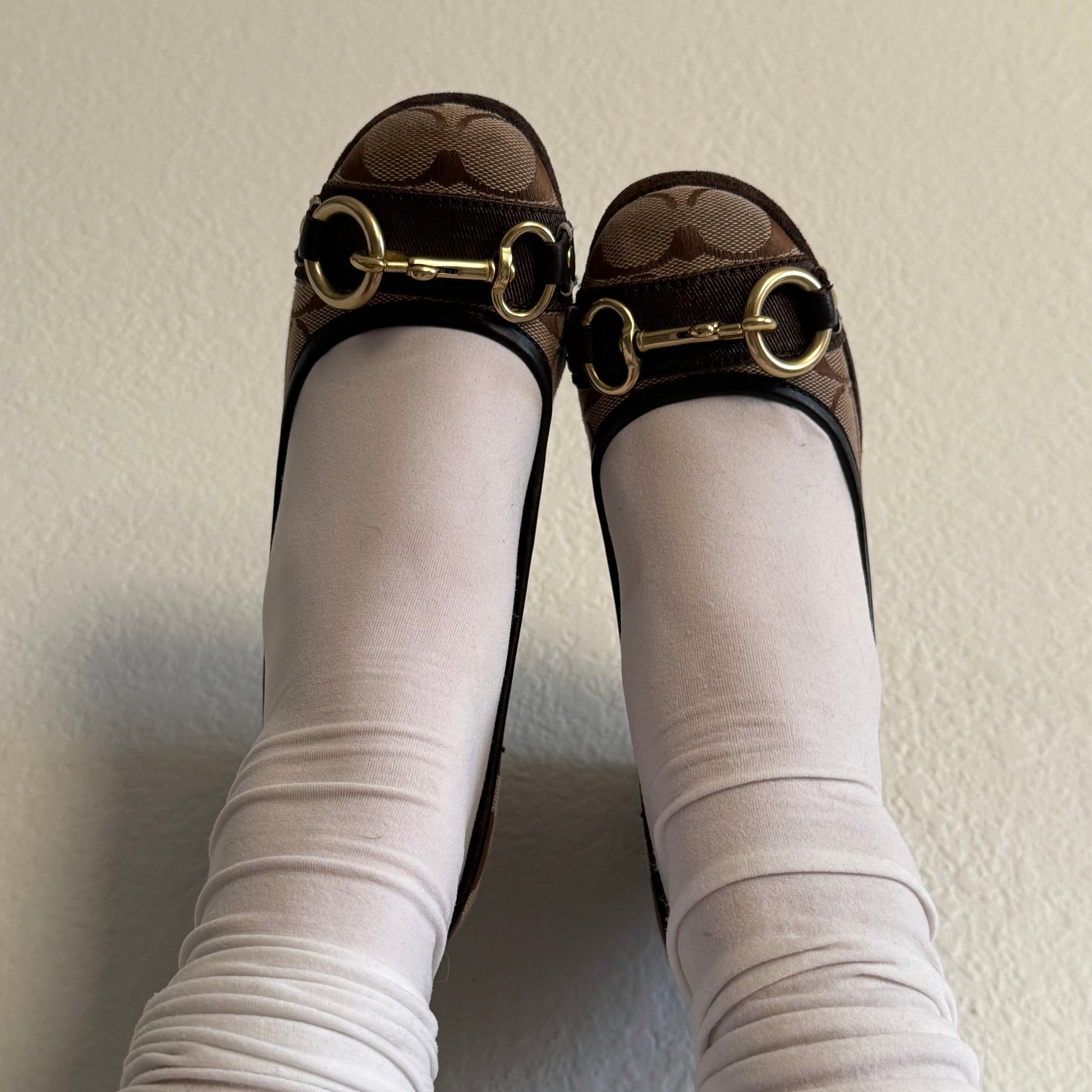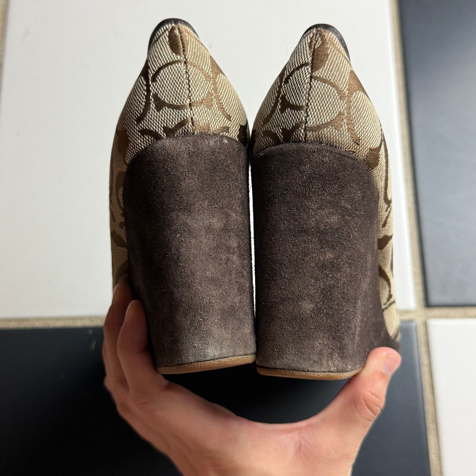 The cutest monogram brown coach wedge heels with a bucle on the front <3 no marked size but looks to be between a women’s 5-5.5! I’m a women’s 6.5 and they do fit but they fit very tight. check measurements before purchasing! flaws: one of the shoes has glue that has come off on the sole. It will be fixed and re-glued before being shipped out. Shoes do show some wear on the back of the heel.