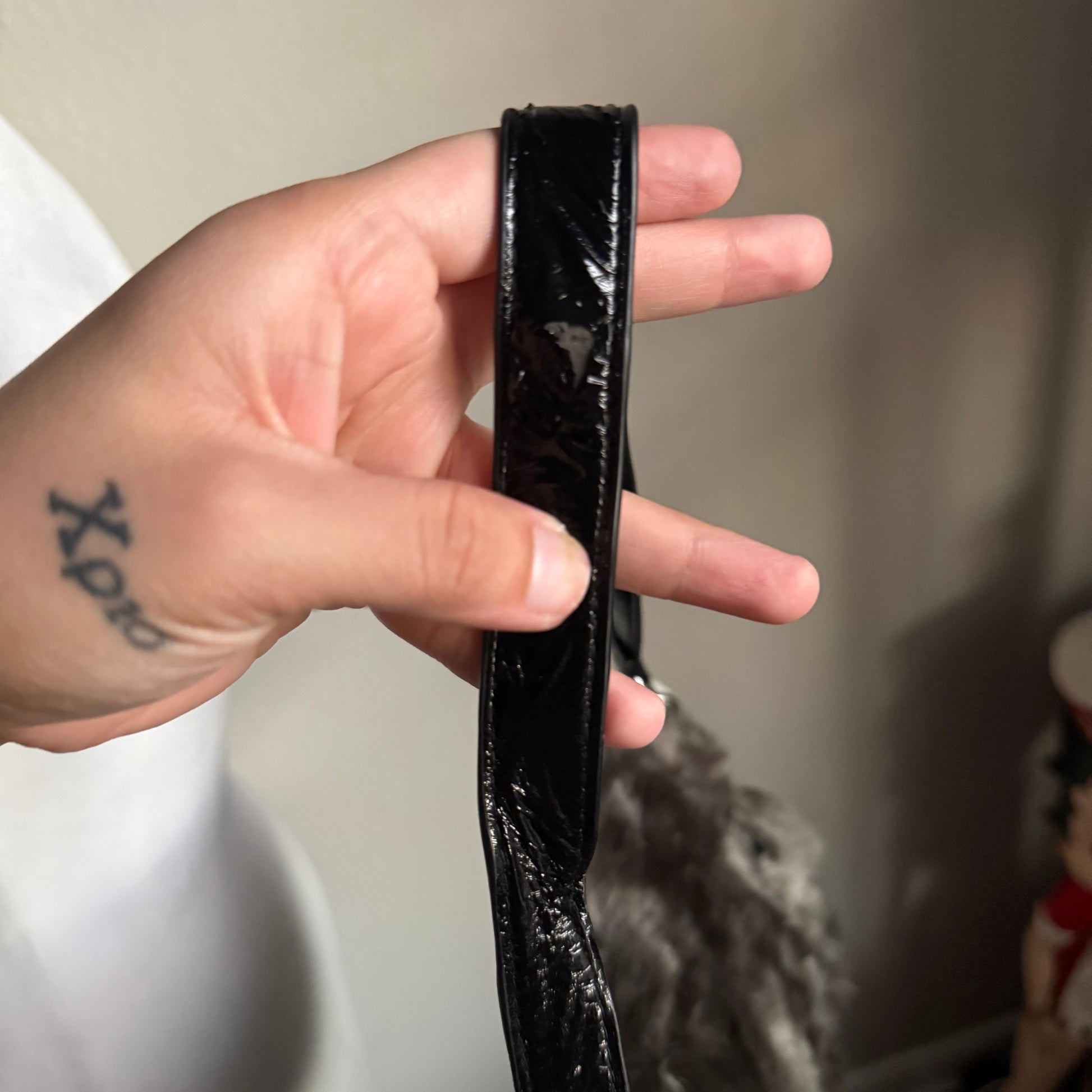 flaws- slight peeling throughout the strap, check photos.