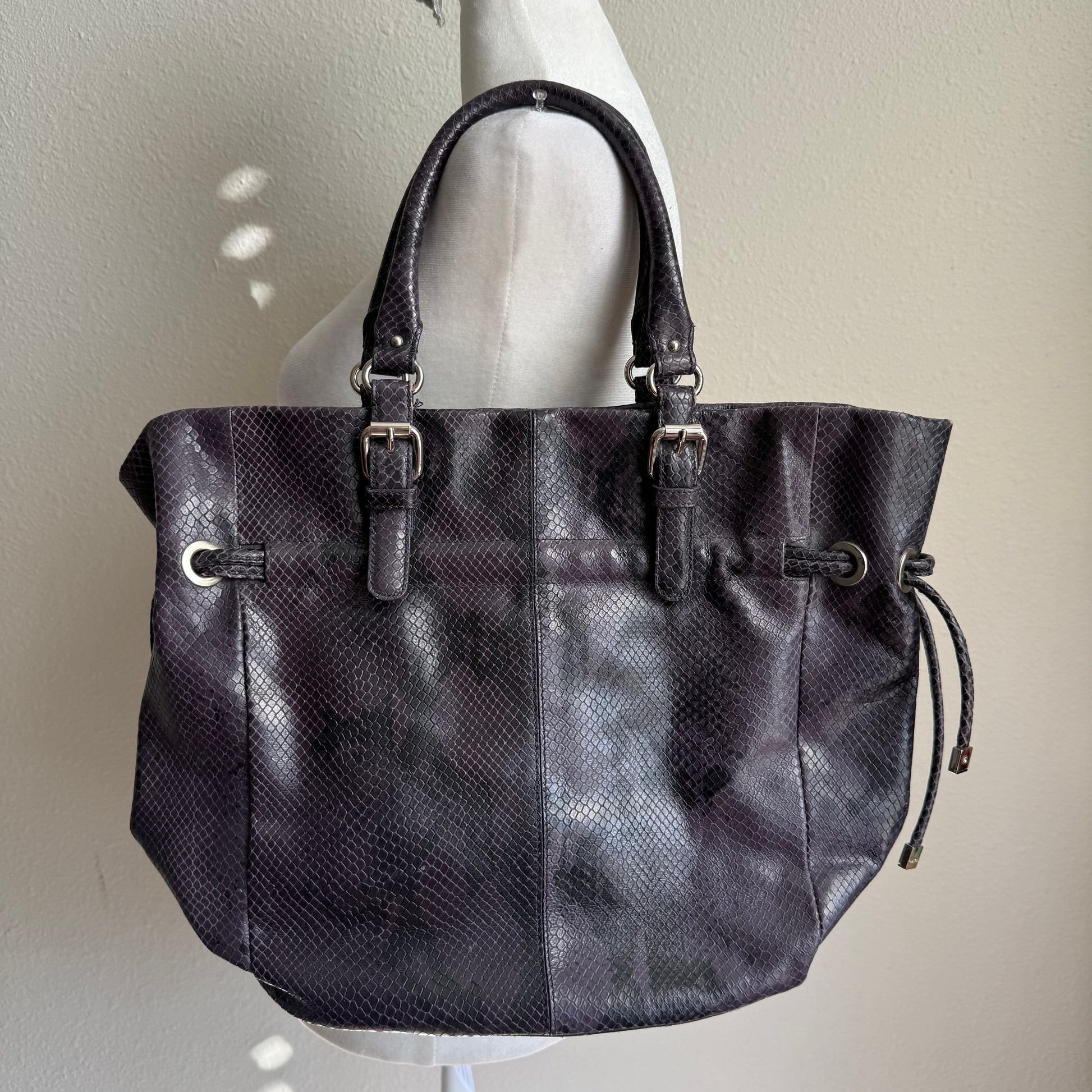 The cutest handbag in a dark purple and black color with a snakeskin shoulder bag with silver buckles on the straps <3