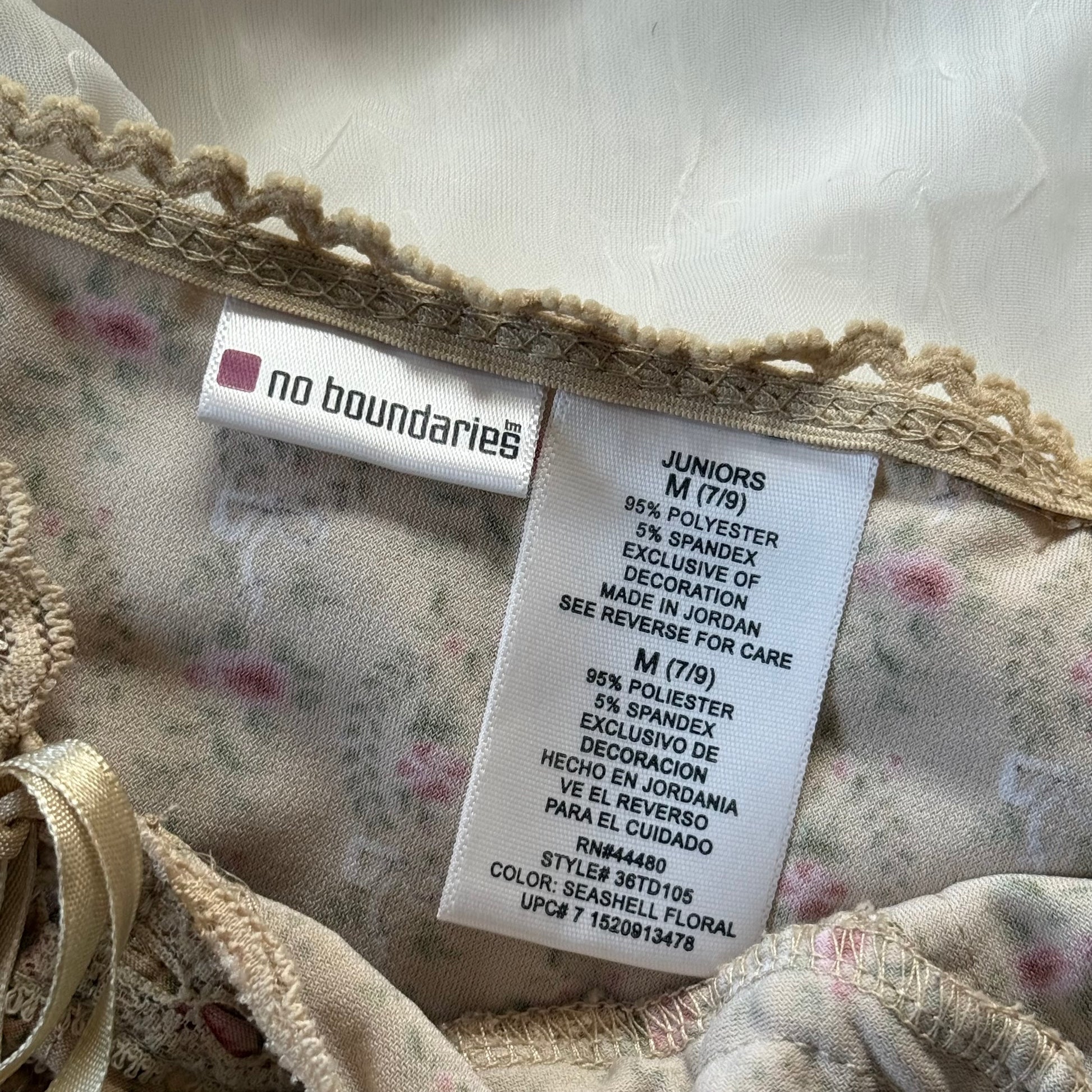 The cutest light beige cami top with spaghetti straps <3 it has the cutest flower and ribbon patterned detailing all over with a ribbon to tie in the middle of the front of the top.