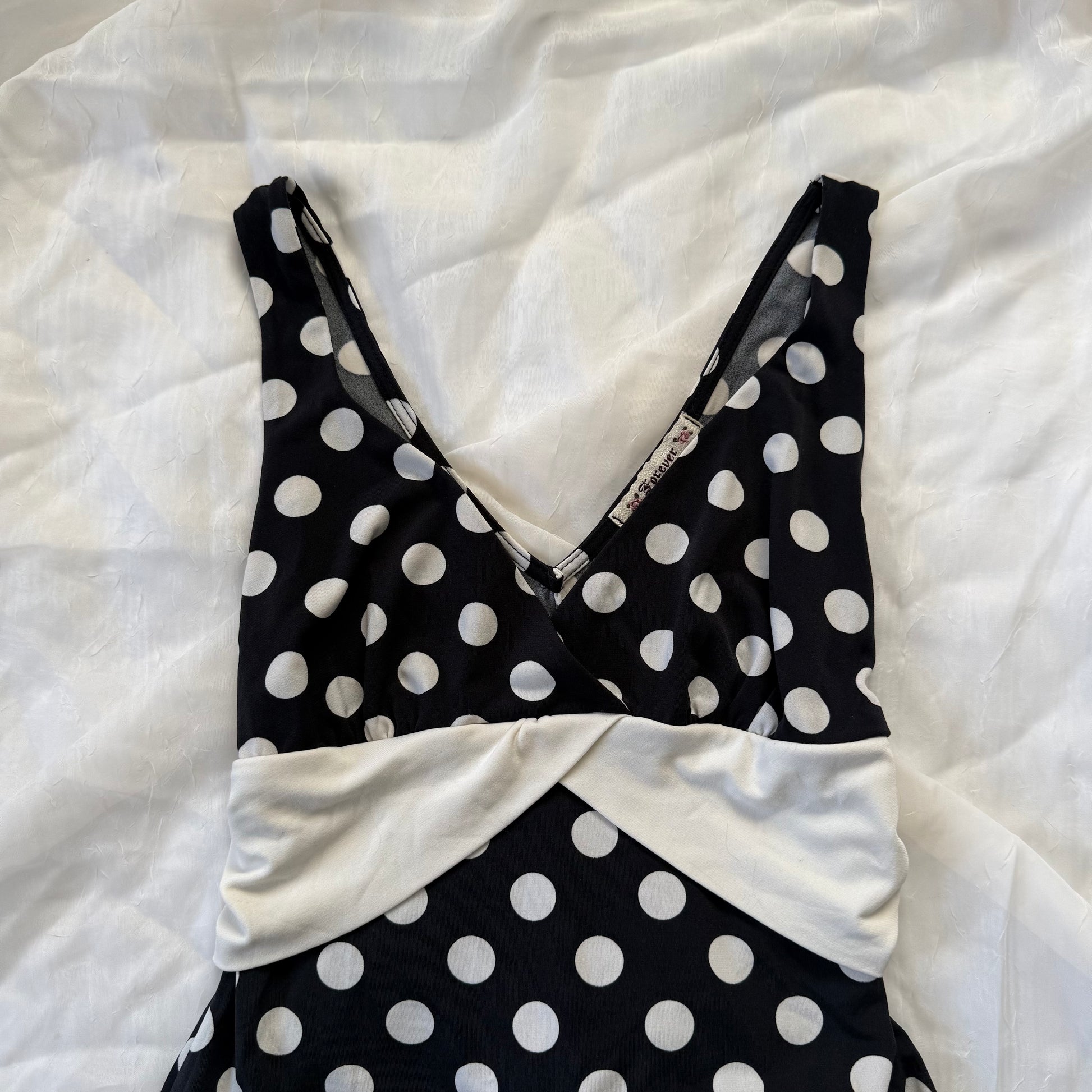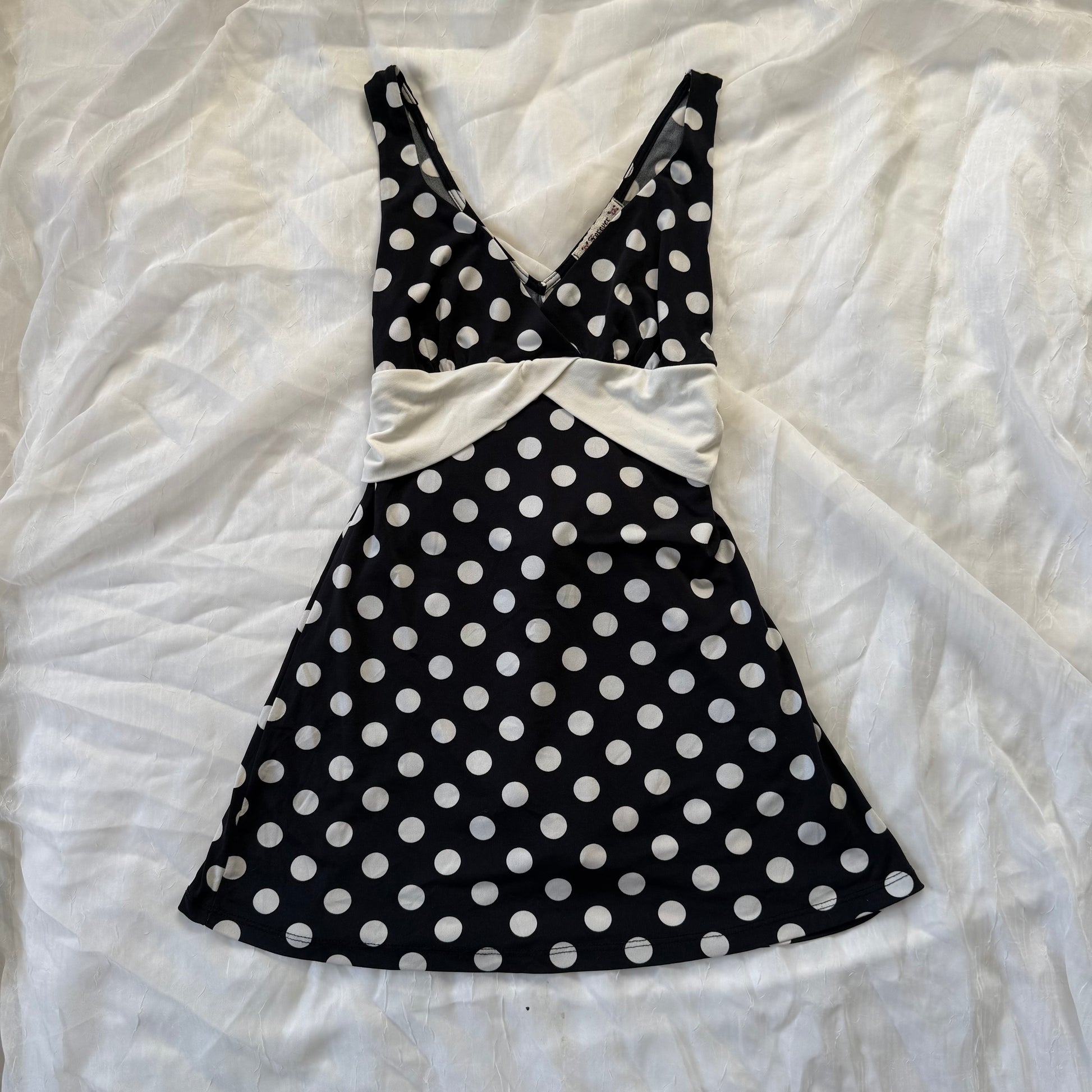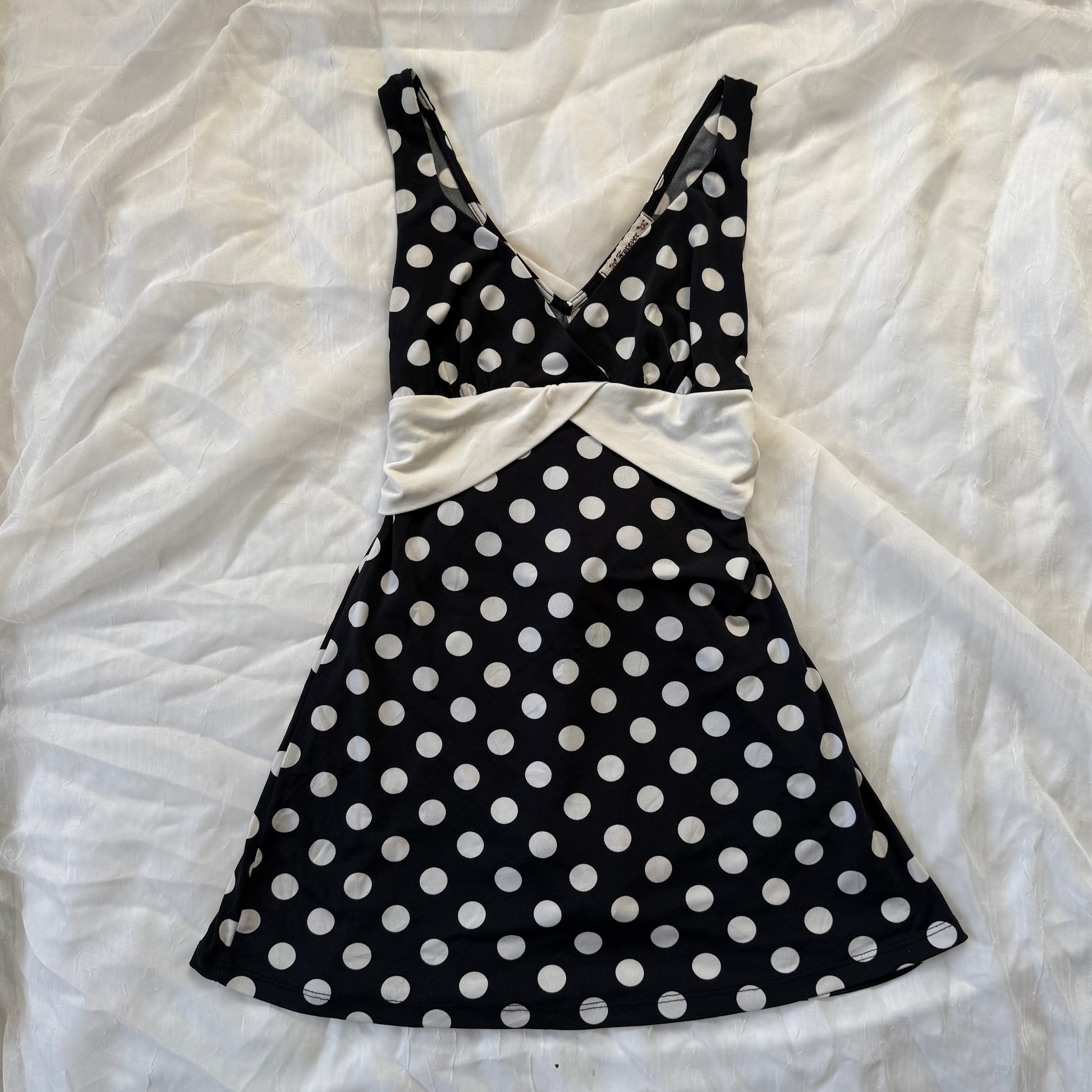 The perfect black cami top with a white polka dot print <3 the middle has a white waistband with strings at the back to adjust to your waist!