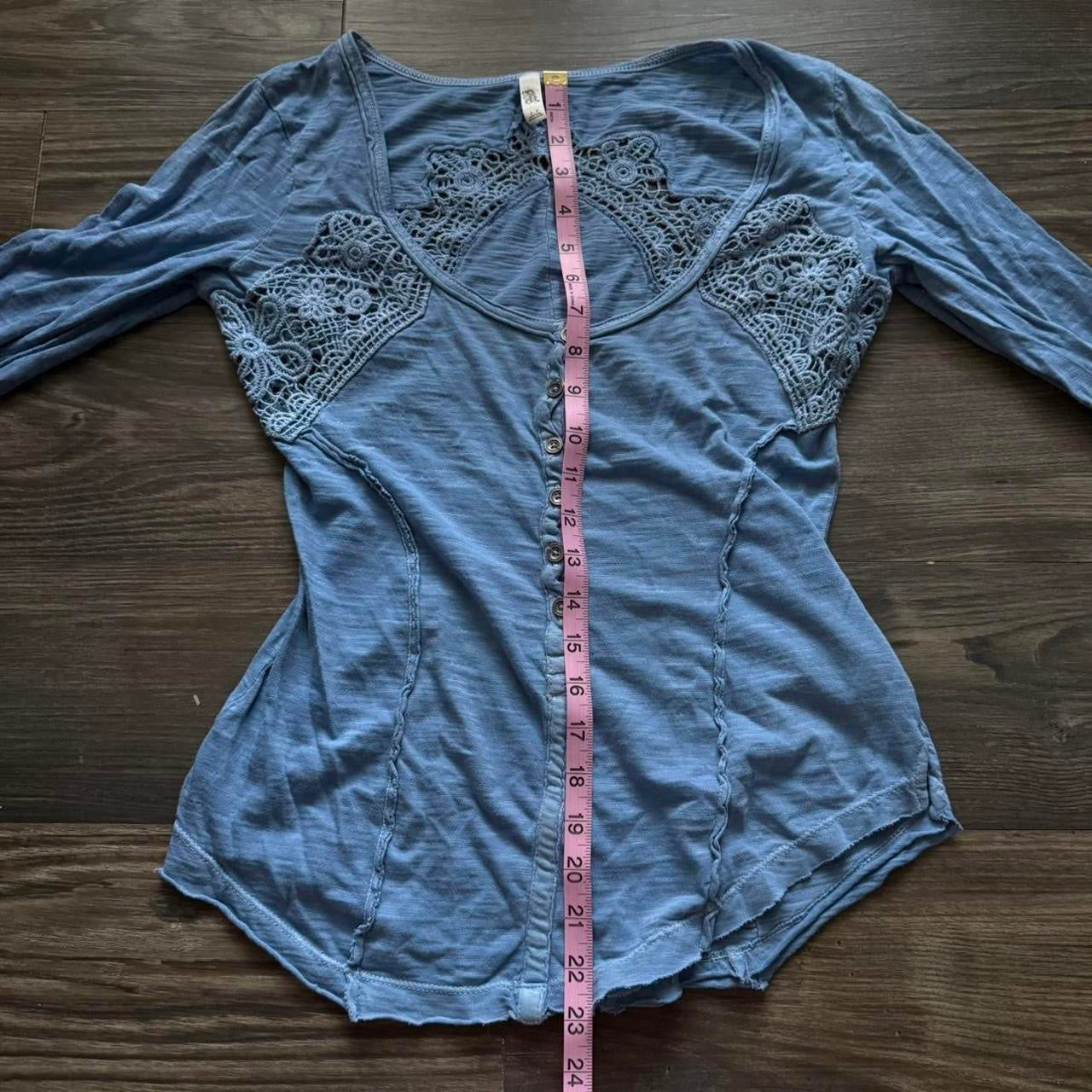 The cutest warm blue longsleeve top by free people with embroidery on the back and shoulders <3