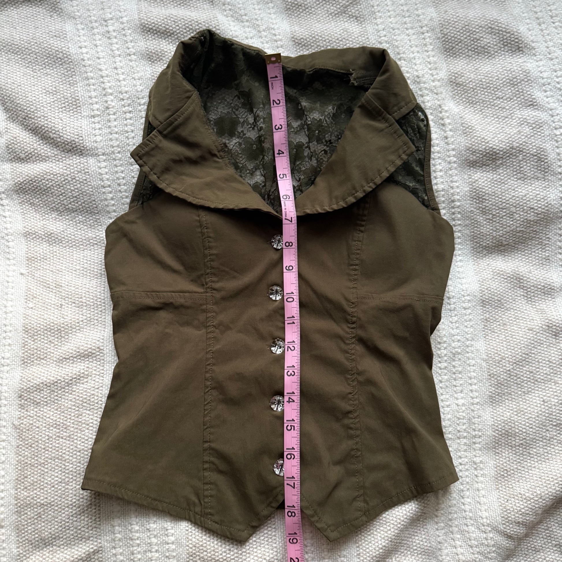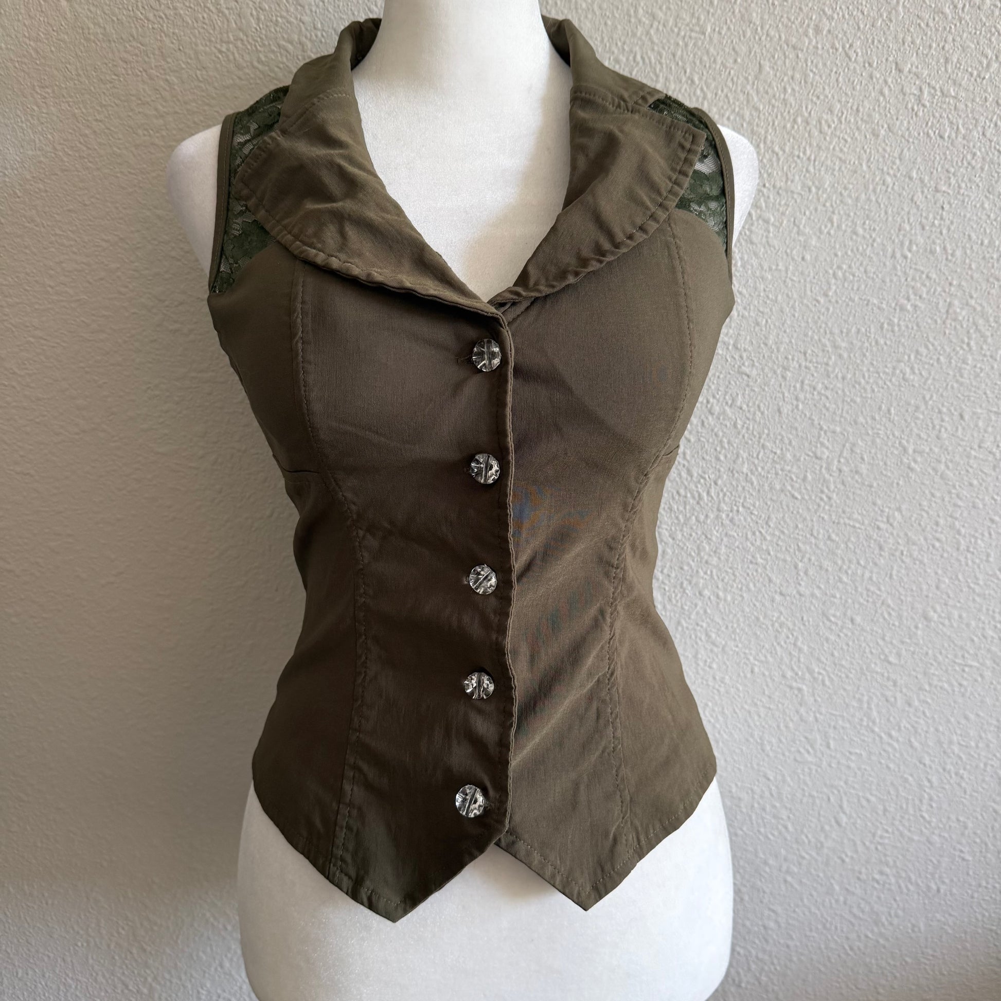 The cutest olive green vest with a lace back <3 the front has shiny gem buttons! the true color is olive green but the lighting distorts it.