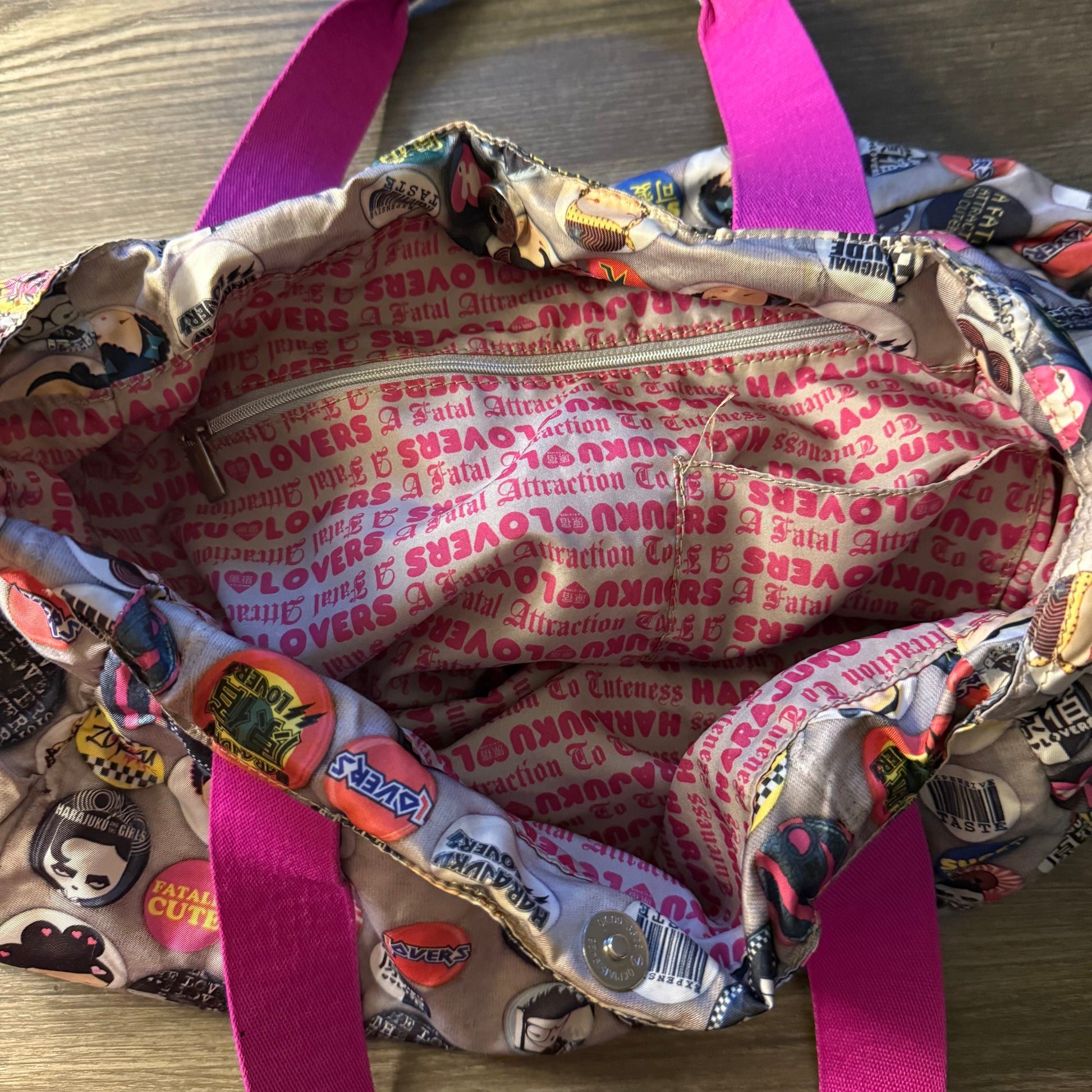 The cutest sholder bag with an insane button design of the different Harajuku doll characters <3 the front has 3 small pins included as well! The sides have cinching elastic <3