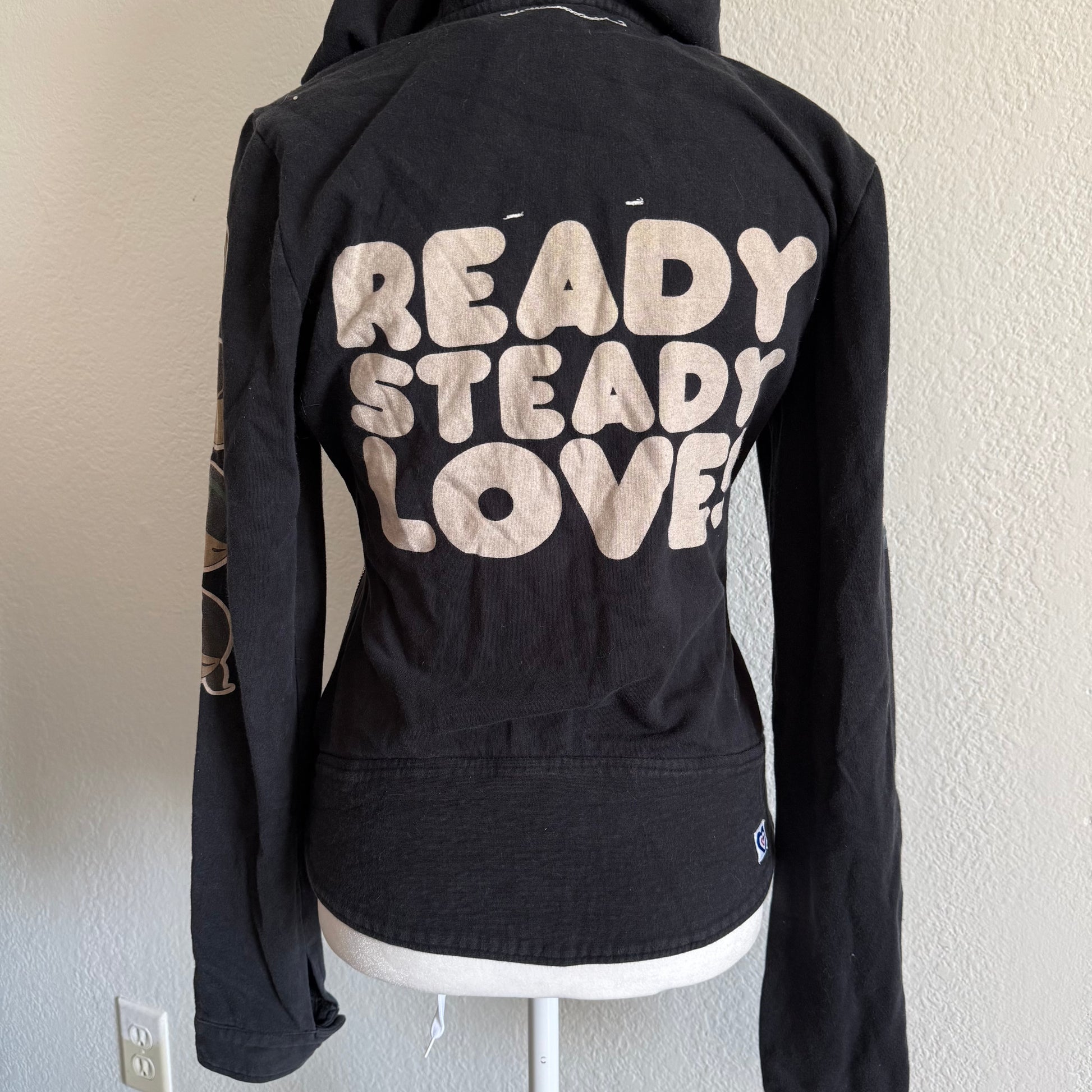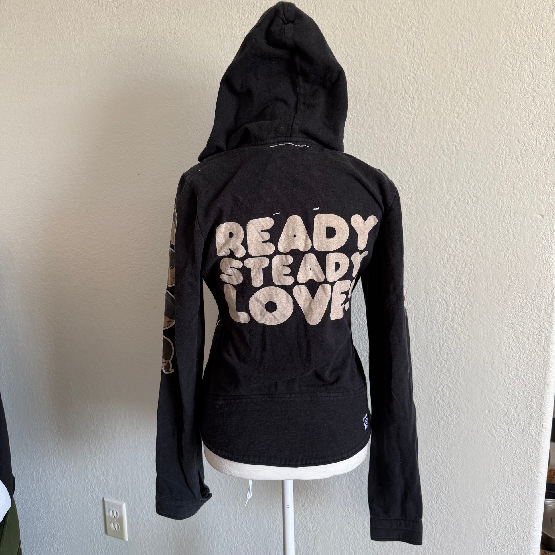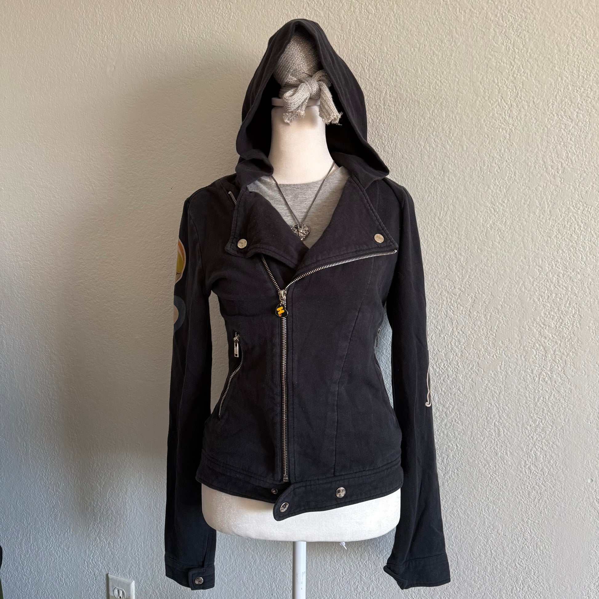 The cutest black zip up asymmetrical jacket with Harajuku characters on the sleeves <3 the back has a cute slogan with a heart! flaws: one of the buttons does not work, check last photo.