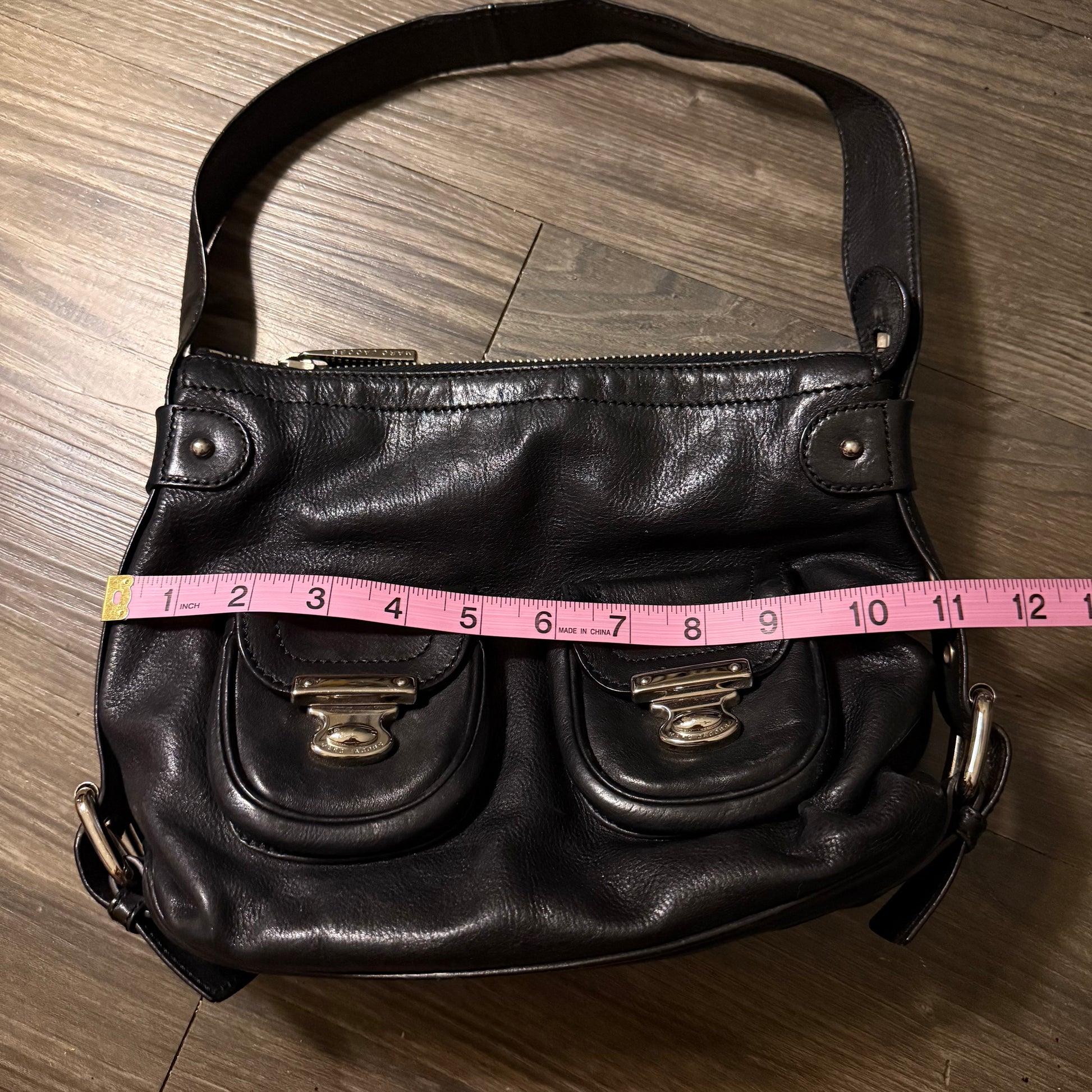 The cutest black shoulder bag by Marc Jacobs with 2 front pockets that have silver buckles <3 the sides of the straps have adjustable buckles to lengthen or shorten the bag! flaws- slight staining inside the rim of the bag!