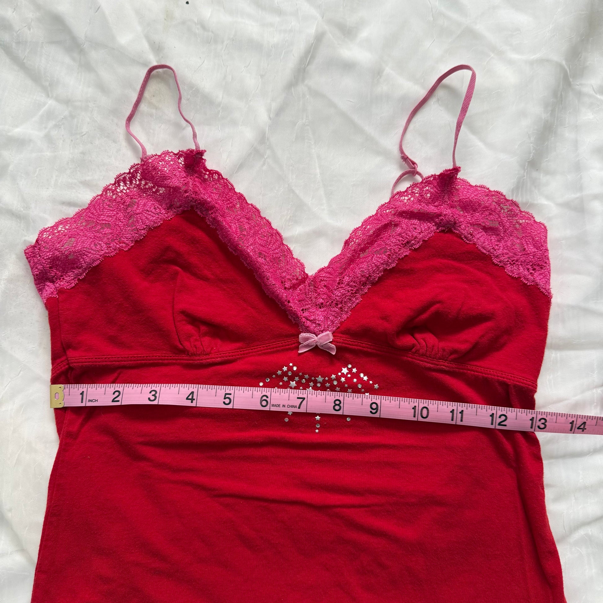 The cutest solid red cami top with pink lace lined on the top of the chest with a little pink bow <3 the middle of the chest has little stars and silver rhinestones. Straps are adjustable and cami does have stretch.