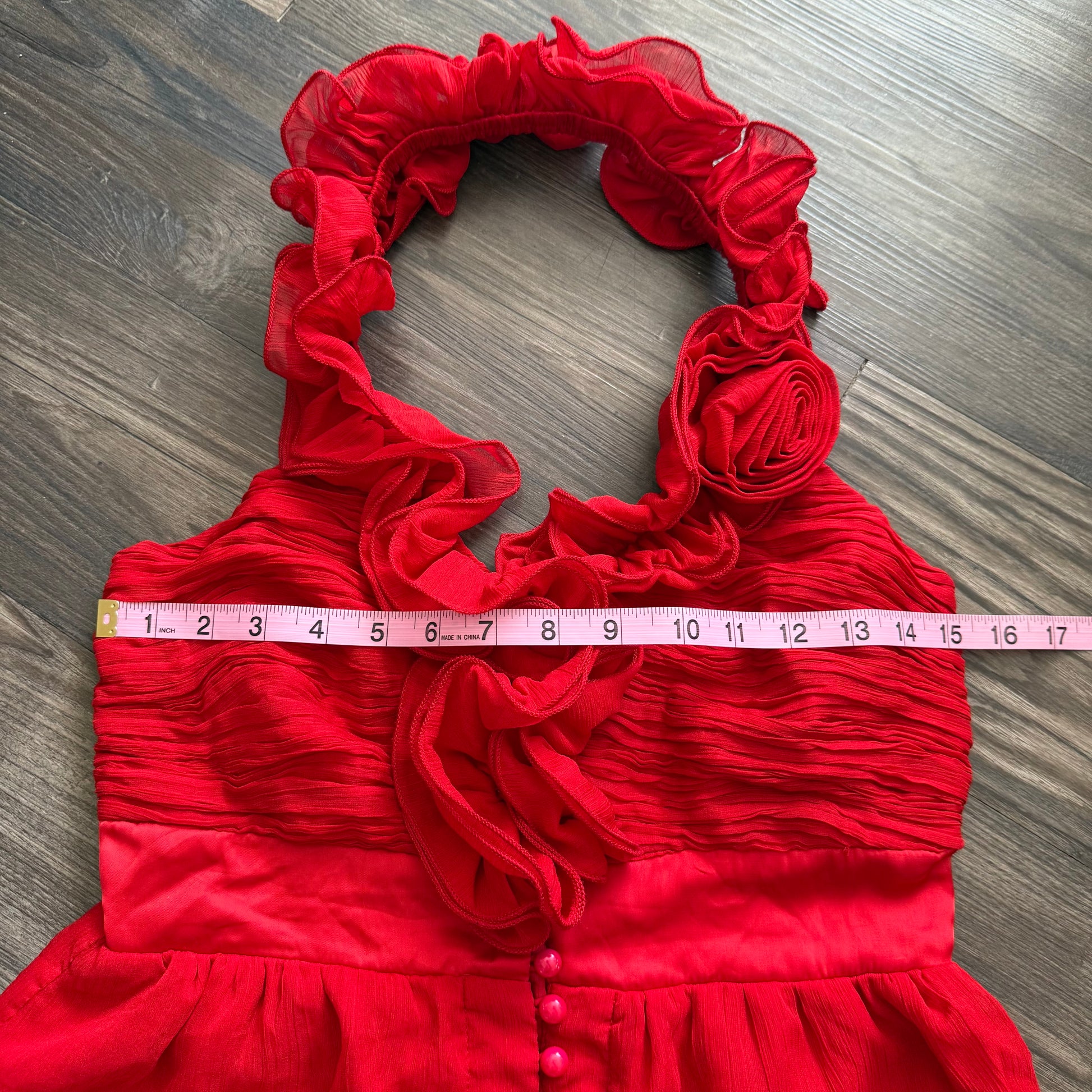 The cutest hot red halter top with roses on the halter and an open back style <3 flaw- missing two buttons, check last 2 photos. Missing buttons are not noticeable at all. Tag says medium but fits smaller then a medium but check measurements!