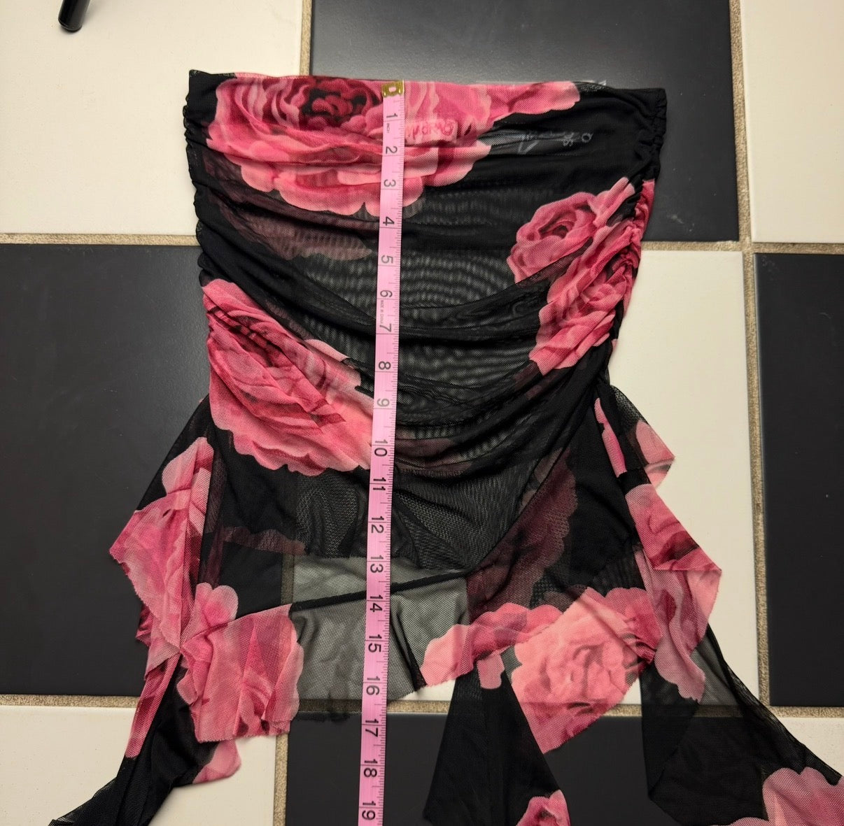 The cutest black mesh top with pink roses <3 tube top with fabric pieces flowing down from the top!