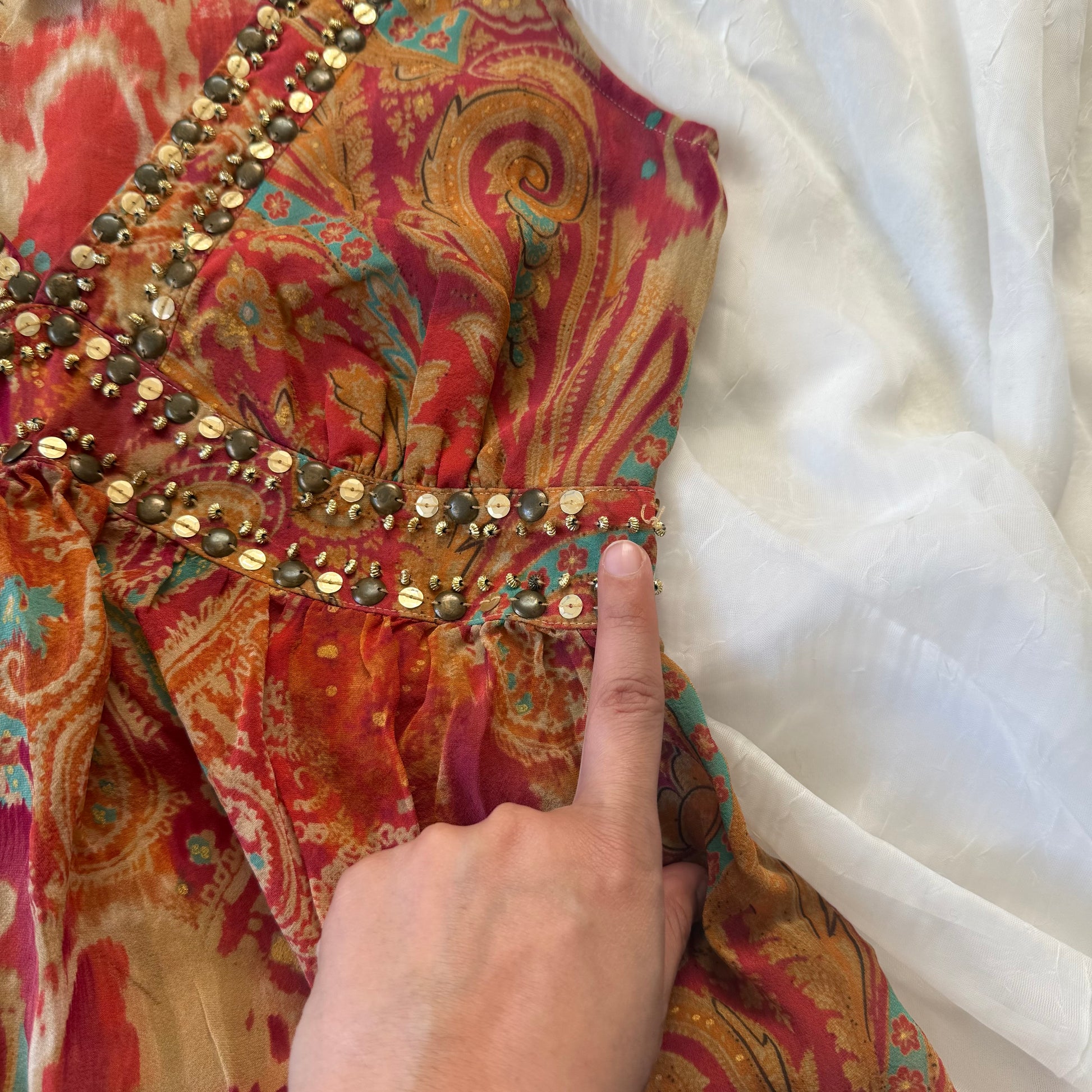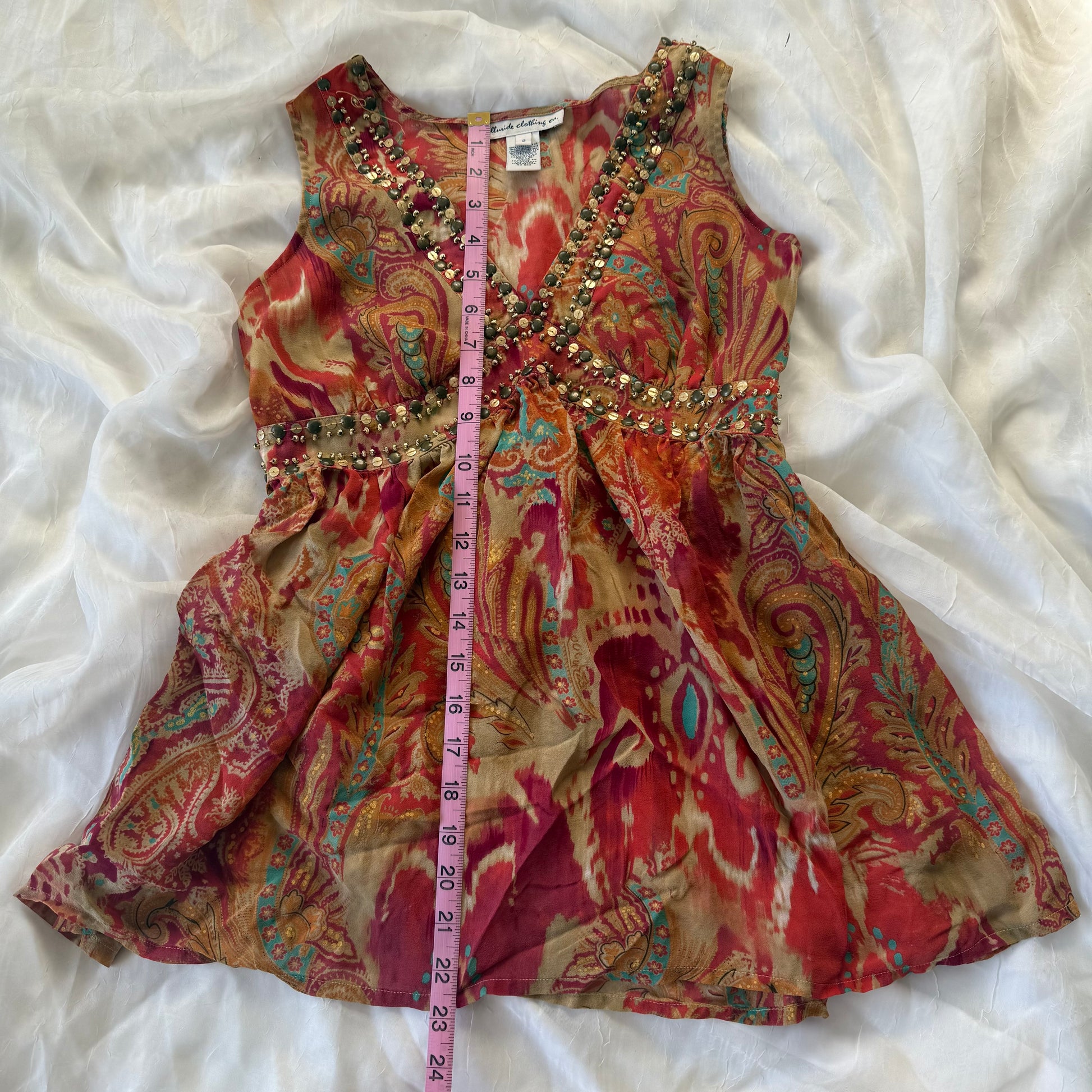 The perfect summer tank top with orange, blue and pink colors <3 the top has golden sequins and studs at the top with a flowy fit!