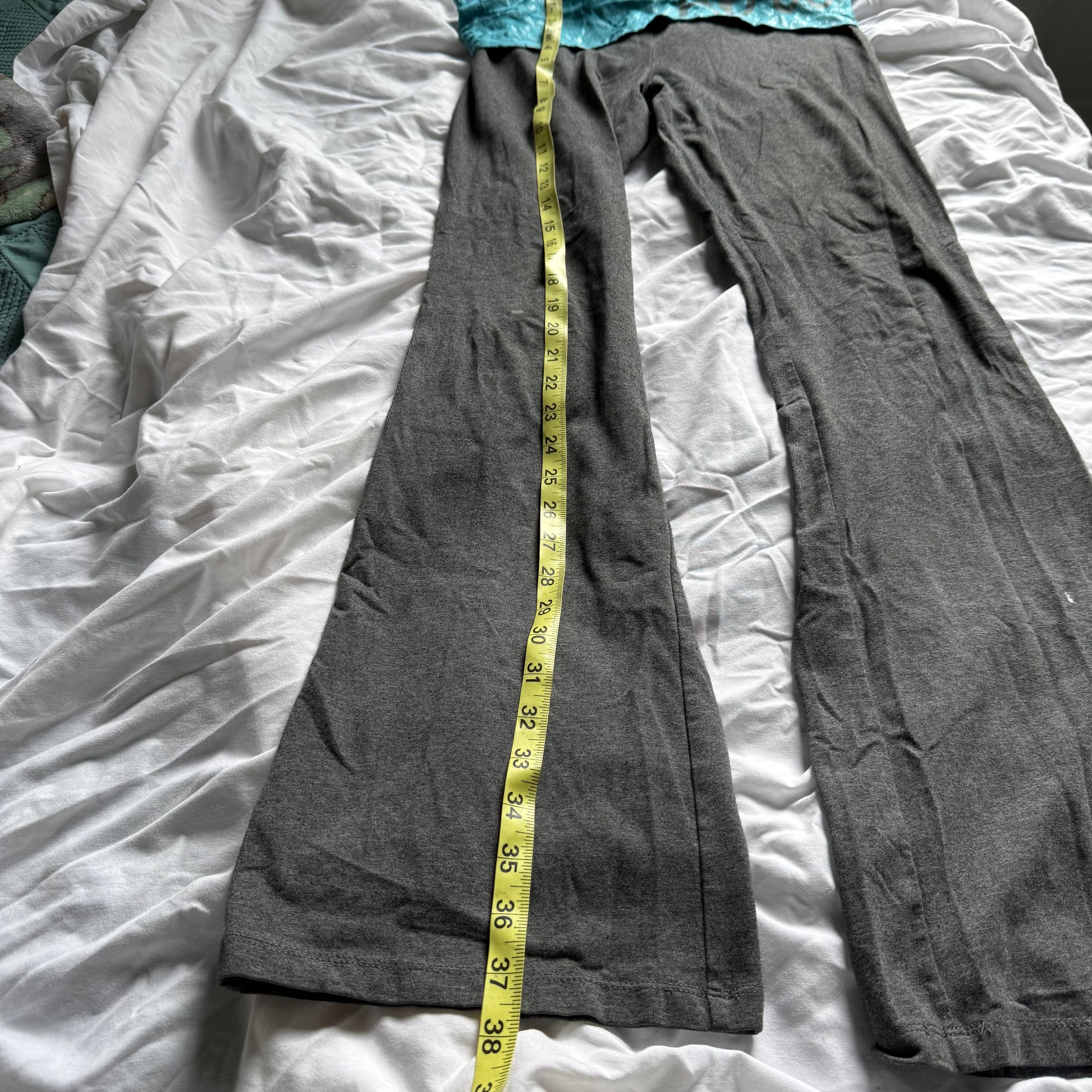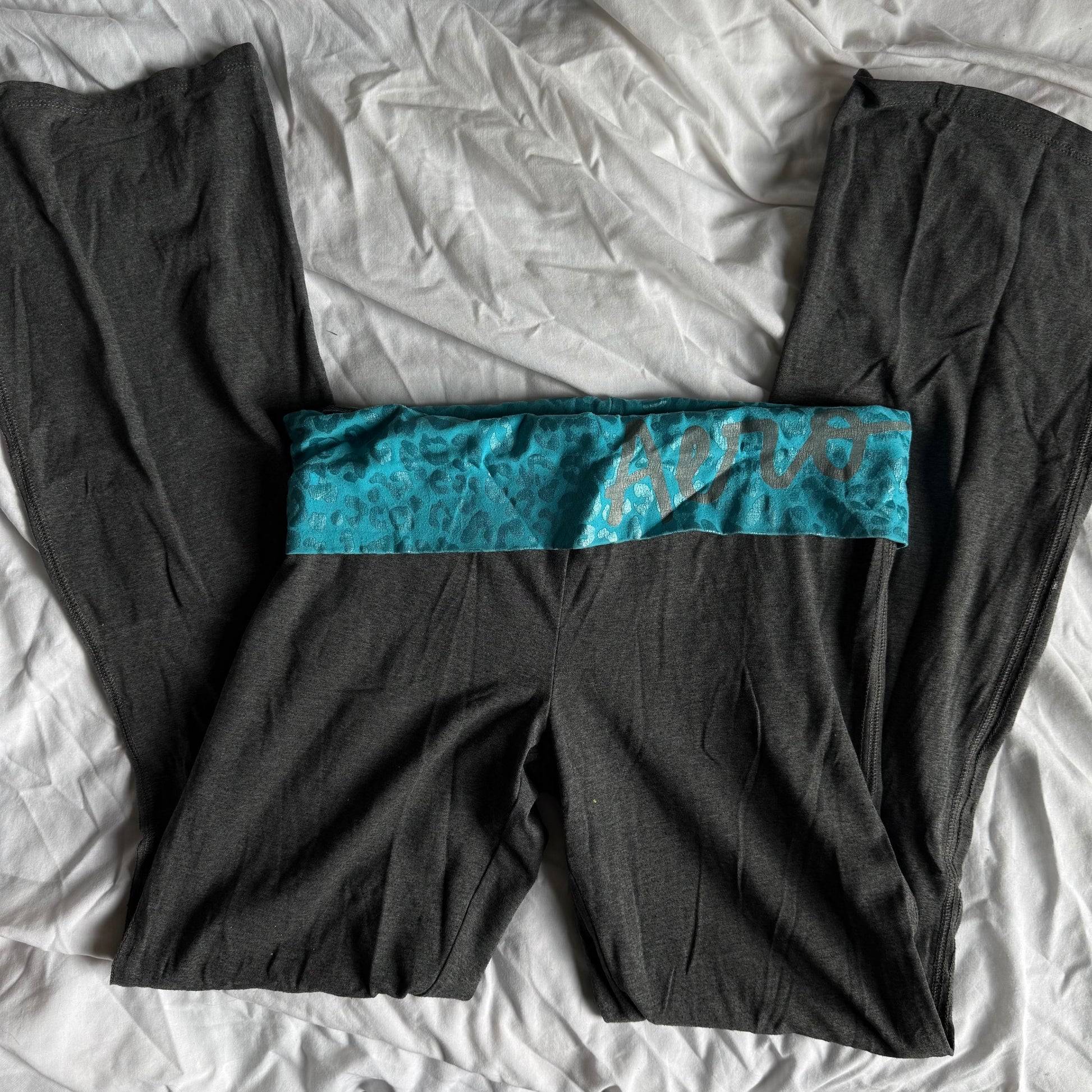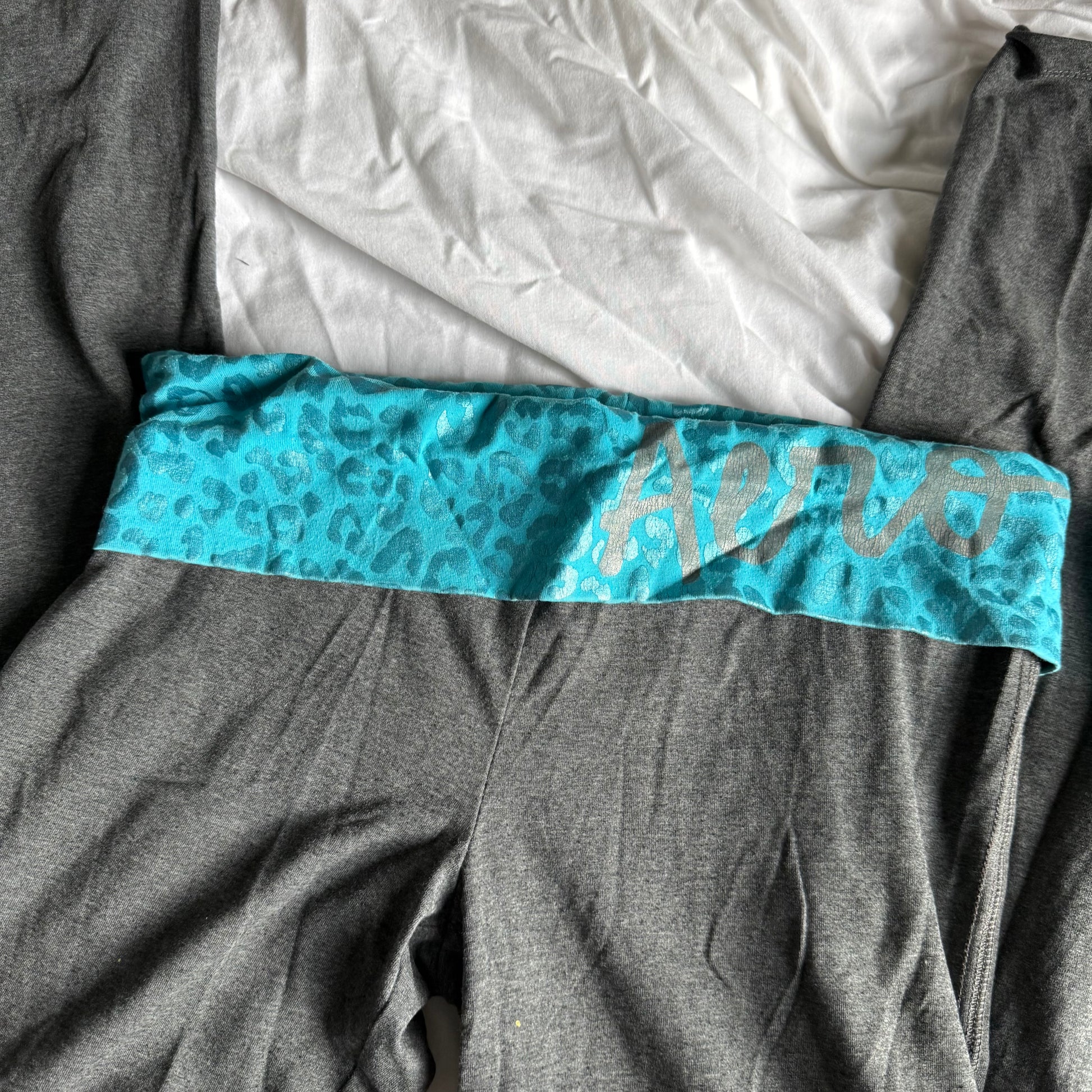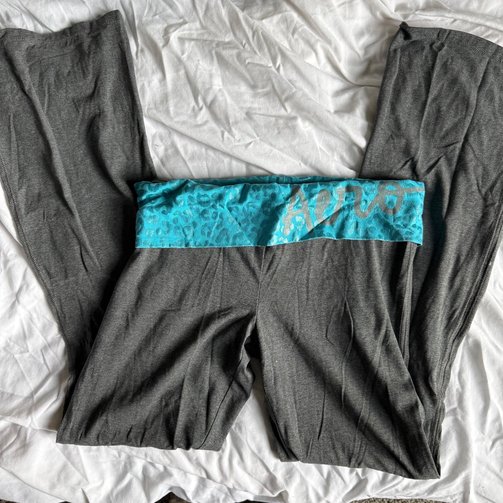 The cutest grey flare leggings with a turquoise aqua blue foldover with a leopard print from Aero <3 flaw: small stain, check photos. Marked a size large, can fit medium but check measurements!
