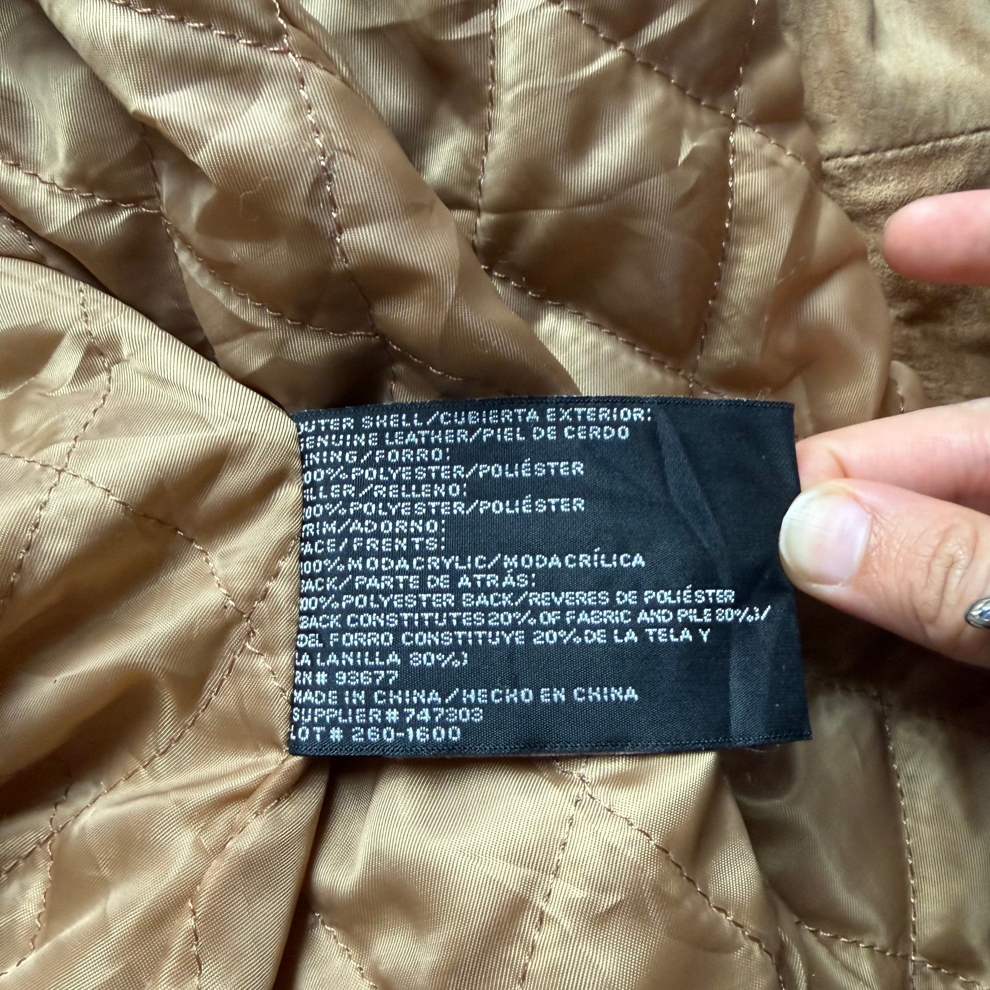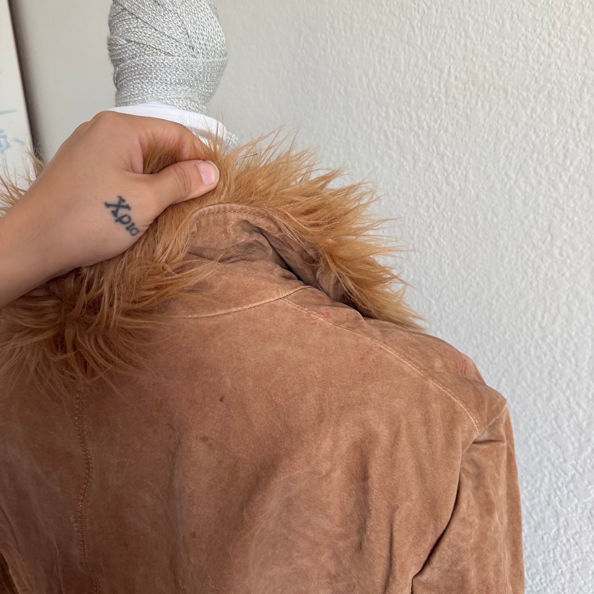 The cutest brown penny lane coat with fur on the cuffs and neck <3 it has a stitching pattern throughout the jacket! flaw: slight stain near the neck, check last photo.